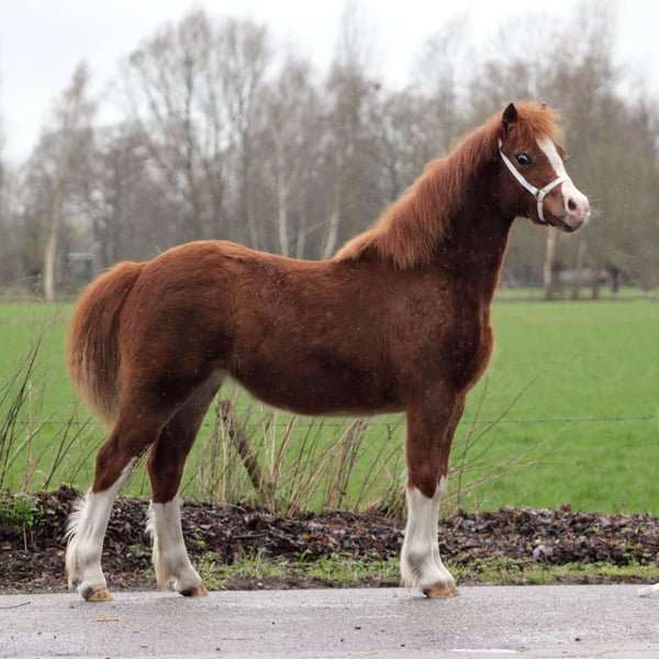 Offered for a new home: Sweet Welsh C Yearling Mare. Sire: Black Stallion Springflower’s Black George. Dam: Chestnut Mare. A friendly and easy-going pony to handle, well-maintained with the farrier and regularly dewormed. Moves well; video available. +31640560496