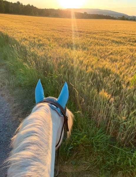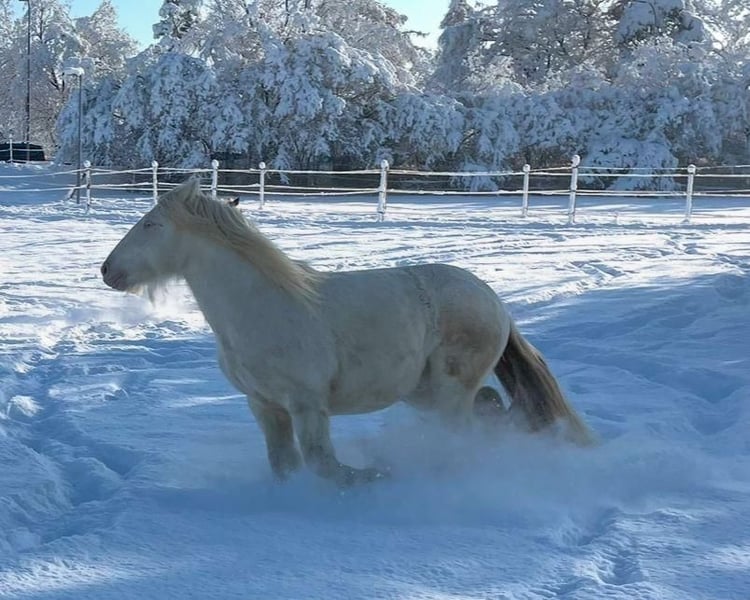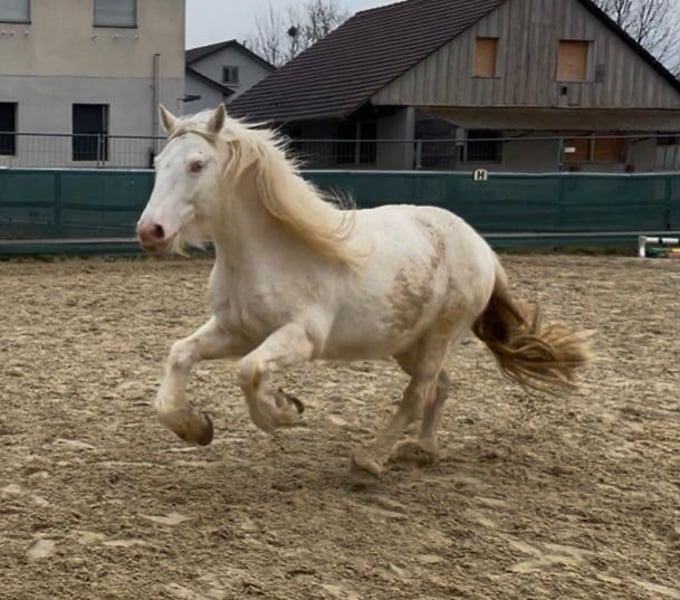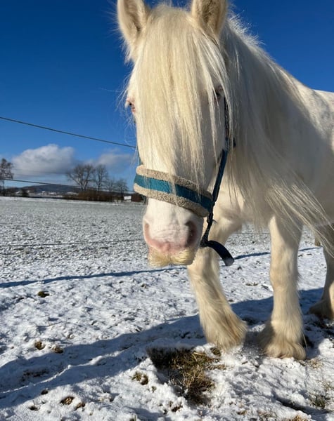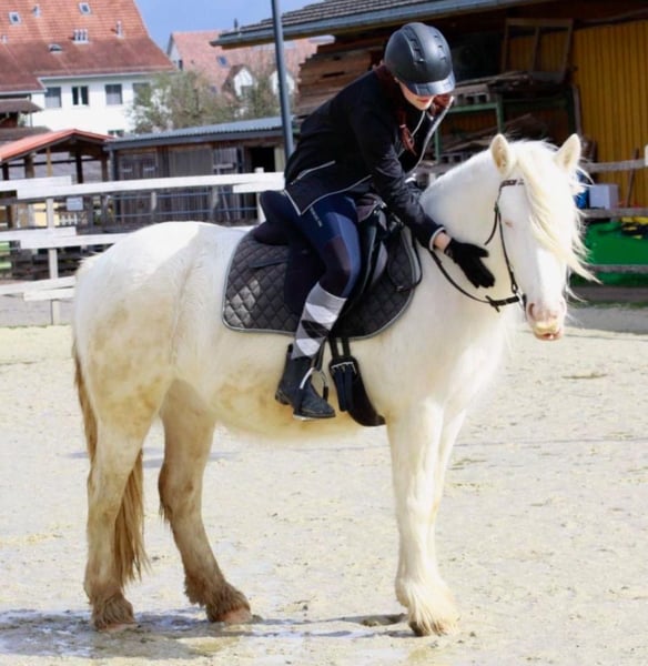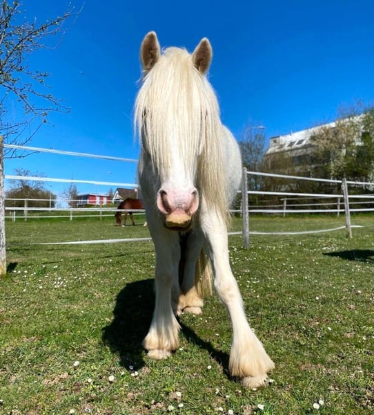 Mani ist ein 7-jähriger Welsh-Tinker-Mix, Stockmass ca. 145cm, mit einem sehr freundlichen und menschenbezogenen Charakter. Er ist neugierig, gewitzt und lernt schnell. Während er unerfahrene Reiter*innen noch etwas herausfordert, lässt sich mit Mani bei konsequenter und feiner Führung hervorragend arbeiten - sowohl vom Boden aus als auch auf dem Sattel. Auf Ausritten mit anderen Pferden zeigt er sich souverän und geht auch mal gerne an der Spitze. Auch allein im Gelände gewinnt er zunehmend an Selbstvertrauen. Ob auf dem Platz oder draussen - er lässt sich in allen Gangarten sehr bequem und sicher reiten. Mani war nun zwei Jahre lang Schulpferd bei uns und hatte nebenbei eine Reitbeteiligung. Für die Zukunft wünschen wir uns für ihn eher einen festen Platz als Freizeitpony, idealerweise mit einer oder zwei festen Bezugspersonen. Aufgrund seiner angenehmen Bewegungen und seines ausgeglichenen Wesens wäre er auch gut für den Einsatz in der Hippotherapie geeignet. Putzen lässt er sich auch von Kindern gerne und ist ebenso bei Knuddeleinheiten immer dabei. ;) Mani ist schmiede- und verladefromm. Typisch für einen Tinker hat er einen schönen langen Behang, den wir jeweils hinten an den Beinen regelmässig kürzen, da er zu Mauke neigt. Bei guter Pflege ist dies aber stabil. Vorne darf der Behang in voller Pracht bleiben. Da wir unseren Bestand leider verkleinern müssen, geben wir ihn schweren Herzens ab. Mani fühlt sich in unserer Offenstallherde sehr wohl; deshalb möchten wir ihn idealerweise in gleiche oder ähnliche Haltungsform abgeben. Für seinen weiteren Weg wünschen wir uns, dass Mani eine geduldige, bestimmte und liebevolle Person findet, die Freude an einem vielseitigen, lernwilligen Partner hat. Bei Interesse kontaktieren Sie uns am Besten per WhatsApp oder SMS: 076 570 86 89