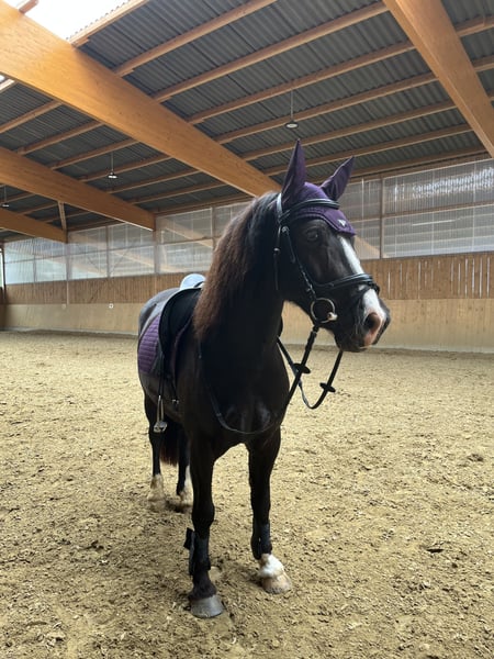 For sale is a stunning, sensitive Welsh Cob gelding in a beautiful chocolate color. With his charismatic presence, charm, and honest nature, he quickly captures everyone's attention. He is always straightforward in his dealings – no bucking, no rearing – and proves to be reliable and clear-headed both in daily training and in the field. He is well-behaved and uncomplicated when it comes to farrier visits and loading. He is accustomed to hacking both in a group and alone, enjoying both equally. Currently, we are working on dressage movements at L-level, with him being motivated and eager to learn. He is familiar with jumping up to E-height, although this has not been our main focus so far. He has experience with turnout and outdoor training, and last year, he gained his first competition experience, which he handled confidently. He currently lives in an open stable/activity yard, and we intend to keep it that way – this type of management suits him very well and aligns with his nature. He is not suitable for beginners or as a purely children's horse. Due to his sensitivity, we are looking for a confident, empathetic rider. A child could ride him in combination with an experienced adult. He is a sensitive horse with a big heart – those who earn his trust will find a reliable lifelong partner in him. Serious inquiries are welcome via personal message.