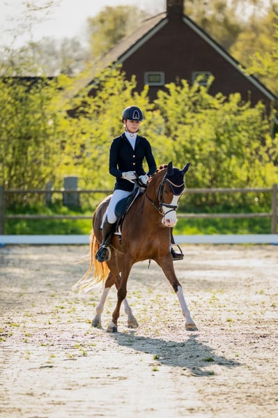 Wij zijn op zoek naar een nieuw huis voor Amaretto i.v.m. overgang naar paarden. Amaretto ( Blokland’s Hoeve’s Activia ) is een getalenteerde 12 jarige koffievos merrie van 147,5 cm en is nu Z2 en FEI klaar. Onlangs regiokampioen 2025 in de hoogste klasse geworden. Ze is een hele goede leerpony van A tot Z. Amaretto heeft veel potentie in de springsport en heeft bij de 70-80 cm haar talent mogen laten zien. Ons doel lag echter meer bij de dressuur vandaar dat we haar niet verder hebben uitgebracht in de springsport. Met haar uitstekende bewegingen en werkwillig karakter is Amaretto een veelbelovende pony voor een ruiter met grote ambities. Ze is braaf bij de hoefsmid/tandarts en op de trailer en scheren is voor haar geen probleem. Wil je meer foto’s of een filmpjes van haar zien dan kun je ons het beste mailen. Prijs op aanvraag