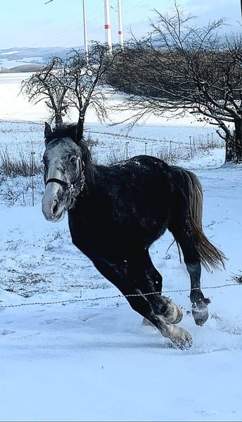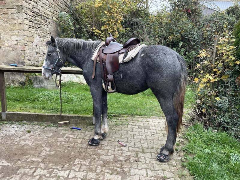Jessie, wird im April 7, Stockmaß: ca 151, Welsh Cob mix, Barhuf, Verladefromm (wir sind mit einem Transporter unterwegs), Westernfreizeit, Gelände, Menschenbezogen. Kennt Straßenverkehr, hat aber noch Angst vor großen Traktoren. Lebt bei uns im Offenstall und steht im Sommer auf der Weide Verträgt sich nicht mit unsere anderen Stute