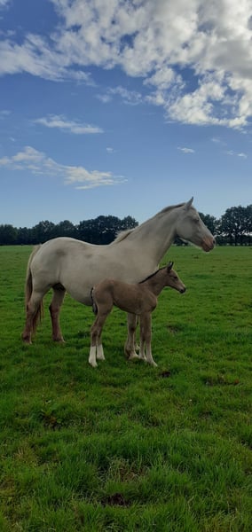 *** Heavenlysmile's Yen-Ai *** Our Yen-Ai is a wonderfully beautiful mare. She will turn 1 year old at the end of July and still enjoys nursing from her mother ;-) She will be 1.60/1.63 m tall, just like her brother and full sister (see last photos). Yen-Ai is a special foal for us, bred in our own breeding operation for three generations! Our passion is fully invested in her, and this is reflected in everything <3 Yen-Ai is bred for sport and leisure. A very strong horse type with a lot of drive. A true beauty, a lovely eye-catcher! She carries the gene within her. This means that in winter she will have a beautiful coat full of mini curls and a lovely, full mane and tail full of curls. She is also hypoallergenic. We have been breeding Curly Horses for 11 years. (17 years with Welsh Cobs :) ) Our goal is to breed a very friendly and versatile hypoallergenic horse. Suitable for young and old, for leisure and top sport! We provide all our animals with the best possible care, with the right vaccinations and timely hoof care. Our stated prices are exclusive of VAT, inspections, and transport costs. If you would like more information or have any questions, please feel free to send me a message!