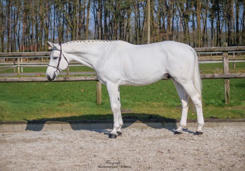Here is an impressive Westphalian stallion, born in 2016. His stallion demeanor is completely free of any stallion-like behavior. This grey impresses with his elegant appearance and his very friendly and balanced temperament. With a height of 16.1 hh, he offers the perfect size for ambitious riders seeking a reliable show jumping partner up to the advanced level. His talent for jumping and athletic build make him an ideal partner for competitive sport. He is perfect for riders who need confidence in the 1.60 m class. Therefore, he is suitable for amateurs as well. The stallion is very well-trained and shows promising jumping qualities. With numerous placings and wins up to the 1.60 m level, he has ample competition experience. Very easy to handle in daily handling, one does not notice his stallion status. If you are interested or would like more information, I am happy to assist. A visit on-site is very welcome by appointment. Experience this exceptional horse in person and see for yourself his great potential!