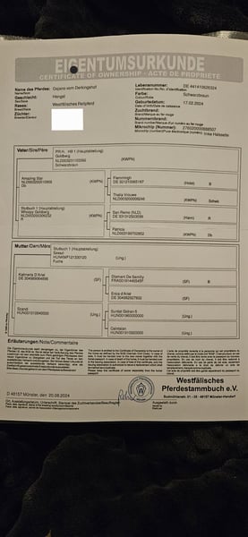 Ein junger Hengst mit großem Herzen, klarem Kopf und internationalem Sportblut Manche Pferde überzeugen durch Leistung, andere durch ihren Charakter. Gajano vereint beides. Gajano ist am 17.02.2024 geboren. Gajano ist kein lauter Typ, sondern ein junger Hengst, der aufmerksam zuhört, mitdenkt und Vertrauen schenkt. Ein Pferd, das man nicht nur ausbildet, sondern mit dem man gemeinsam wächst. Was Gajano besonders macht, ist sein außergewöhnlich angenehmes Wesen. Er ist sehr menschenbezogen, sucht aktiv den Kontakt und zeigt sich im täglichen Umgang freundlich, neugierig und kooperativ. Neue Situationen meistert er unerschrocken und nervenstark, ohne dabei überdreht zu reagieren. Er arbeitet gerne mit, zeigt eine klare Arbeitsbereitschaft und bleibt dabei stets ausgeglichen. Für sein junges Alter bringt er bereits eine bemerkenswerte innere Ruhe mit. Neue Eindrücke nimmt er interessiert und gelassen auf. Man merkt ihm an, dass er lernen möchte und Freude daran hat, Aufgaben gemeinsam mit dem Menschen zu lösen. Gajano kennt bereits das Grund ABC im Umgang, altersgerechte Bodenarbeit sowie lange, ruhige Spaziergänge im Gelände, auch außerhalb des Hofes. Dabei zeigt er sich stets brav, aufmerksam und mutig. Eigenschaften, die man nicht antrainieren kann, sondern die tief im Charakter verankert sind und später im Sport den entscheidenden Unterschied machen. Abstammung Auch seine Genetik erklärt vieles von dem, was Gajano bereits jetzt zeigt. Sein Vater Goldberg KWPN ist ein dressurbetonter Hengst mit sehr guter Rittigkeit und überzeugenden Grundgangarten. Er war zweiter Reservesieger der westfälischen Körung und ist bekannt dafür, typvolle, leichtrittige und kooperative Nachkommen zu vererben, Pferde, die Spaß machen und sich ehrlich ausbilden lassen. Die Mutter Szandi, eingetragen im Stutbuch I des ungarischen Warmbluts, bringt Substanz, Härte und Leistungsbereitschaft mit. Sie gibt ihrem Sohn nicht nur Kraft, sondern auch mentale Stärke und Ausgeglichenheit. Der Muttervater Kalmers d’Ariel Selle Français ist ein Sohn des legendären Diamant de Semilly, einem der erfolgreichsten Springvererber der Welt, international bis 1,60 Meter erfolgreich, Team Weltmeister und Vater unzähliger Grand Prix Pferde. Ergänzt wird diese Linie durch ungarisches Gidran Blut, bekannt für Gesundheit, Langlebigkeit und Zuverlässigkeit. Sportliche Perspektive Gajano vereint genetisch wie charakterlich beste Voraussetzungen für den Sport. Er zeigt gute Grundgangarten, natürliche Balance und lässt deutliches Springvermögen mit Kraft und Technik erwarten. Gajano eignet er sich hervorragend für den Springpferdesport, die Vielseitigkeit oder eine vielseitige Grundausbildung mit späterer Spezialisierung. Dank seines klaren Kopfes und seiner Menschenbezogenheit ist er besonders interessant für Reiter, die Wert auf ein ehrliches, mutiges und verlässliches Nachwuchspferd legen. Kurzinfos Name Gajano vom Derkingshof Rasse Westfälisches Reitpferd Geschlecht Hengst Farbe Schwarzbraun Geboren 17.02.2024 Korrekt registriert und mikrogechipt Altersgemäß gefördert und bestens sozialisiert ✨ Fazit Gajano ist ein junges Pferd, das man nicht nur sieht, sondern fühlt. Ein Hengst mit feinem Charakter, großem Vertrauen zum Menschen und einer Abstammung, die alle Türen offenlässt. Ein Nachwuchspferd für Menschen, die nicht nur Leistung suchen, sondern einen echten Partner für die Zukunft. Standort: Legden 01514 1677577 Weitere Informationen, Fotos und Videos gerne auf Anfrage.
