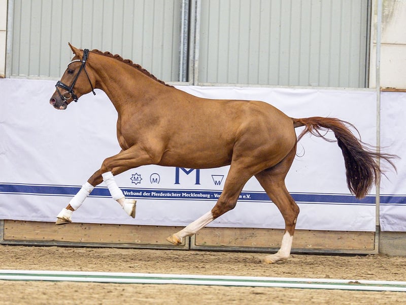 Total Diamond/Fürst Wilhelm/Ehrentusch This striking chestnut stallion epitomizes a top-class dressage horse. With ample activity from the hindquarters and a spectacular front leg, this young horse is well-suited for the grand arena. His impressive uphill canter, combined with plenty of scope, leaves no wishes unfulfilled for the ambitious rider! His sire, Total Diamond, achieved an 8.05 in his performance test in Schlieckau and has produced six licensed sons, including three premium stallions. The stallion impresses with his expressive presence and consistently active hind leg. Performance Data: Sire: 50TT, Focus on Dressage, 8.05; according to FN, 7 licensed sons, first NK, highly successful in RPF Dam Line: Granddam: 1 successful sport horse NK: DoLorean PK (by DeLorean), dressage M*, winner/Dressage Performance Test (DPT) L/ dressage S* success Great-granddam: 1 licensed son: Don Lino (by Donnerbube I), dressage L*, winner/Dressage Performance Test M/ dressage M* success; 4 successful sport horse NK including: Eangy (by Ehrentusch), SPR 95cm winner/SPR 115cm success, Diamond Girl 22 (by Diamond Hit), dressage M* winner, Earl of Brock (by Ehrentusch), RPF/dressage A* success Hannover Mare Line 1191306 (Antipathie) Licensed stallions: Fürst Khevenhüller (by Florestan), international GP dressage success, Federal Champion 5-year-old DPT and vice-champion 6-year-old DPT; Royal Angel (by Rohdiamant), dressage S* success; Founder (by Foundation), international S* dressage (CDIYH), success; Bohemian (by Bon Coeur), Jay Destino (by Danciano), Harlem D (by Vivaldi), Don Bedo I & II (by Donnerhall), Stan the Boy (by Stan the Man xx), Grunewald (by Grande), Ultra Time (by Londontime), Royal Blend (by Rotspon) dressage IM I success; Eistanz (by Eisenherz I), Shakespeare in Love (by Sherlock Holmes), Zagallo (by Zeus), Escuro (by Escudo II), Le Patron (by Laptop), Sonique (by Wolkenstein II), Pik Star (by Pik König) Successful show jumpers: Lou 38 (by Lordanos), international success at 150cm; Van Lou (by Valentino), 150cm/145cm success; Gracie 3 (by Grannus), 140cm success; Paola W (by Pablo), 150cm/145cm success; Landrover 6 (by Landadel), 140cm success; Centino SEW (by Cento), 145cm success; Chardon Jmen (by Calisco Jmen), international success at 160cm; All In One B (by Araconit), international success at 150cm; Skelton H. (by Stakkato), 140cm success; Ukulele 3 (by Uccello), 140cm success; Let’s go Ritchi (by Laptop), 145cm success; Robin 300 (by Ramiro’s Son II), international success at 140cm; Can Live (by Contendro I), 140cm success; Kalia (by Laptop), 145cm success; Laury S (by Lauries Crusador xx), 140cm success; La Baba Jaga (by Lenardo), 140cm success; Coolio (by Chasseur I), international success at 160cm; Lavinio 12 (by N.N.), 140cm success; Colorado B II (by O-Piloth), 140cm success; Isadore de Chenemont (by Feo), 160cm success; Piccolo 112 (by Pik König), 140cm success. Dressage Successes: Dancing Carlos (by Dresemann), dressage S* success; Santana AV (by Sir Schölling), international IM I success; Forever Fun (by Florestan I), dressage S* success; Rodino 5 (by Rohdiamant), international IM I success; Bradley 6 (by Breitling W), dressage S* success; Ronika W (by Roadster), international IM A success; Roxana W (by Roadster), dressage S* success; Fabienne W 5 (by Freudentänzer), dressage S* success; Ashley W (by Alabaster), international IM I success; Waldbube (by Walldorf I), dressage S* success; Amicelli 67 (by Amann), dressage S* success; Boccacio 3 (by Bolero), dressage S* success; Freixenet 63 (by Florestan I), success at the Young Riders Tour; Drops of Jupiter (by Desperados), dressage PSG (USA) success; Baily (by Bolero), international IM I success; Abacus 10 (by Argentan I), dressage S* success; Sandro’s Welt (by Sandro Hit), international IM I success; Don Corleone 12 (by Donnerhall), GP dressage success; Dio Domingo (by Don Frederico), international GP (CDIU25) success; Wily Fox 2 (by Wolkentanz I), dressage S* success; Walk On Top K (by Worldly I), GP dressage success; Freundeskreis 2 (by Fürst Fugger), dressage S* success; De Beers (by De Niro), international IM I success; Donero 6 (by Don Schufro), international IM I success; Why Me (by Westerland), international GP dressage success; D’Amour WS (by Depardieu), IM I success; Wedekind 6 (by Wittinger), IM I success; Dolce Far Niente 3 (by Damon Hill), IM I success; Expression (by Sibirian Express), international Young Riders Tour/IM I success; Lafayette HQ (by Loerke), international GP success. https://horse24.com/de/auctions/details/5-mecklenburger-koertage-online-auktion-454 Contact Person: Jannes Sonnenberg Phone: 0170 5417431
