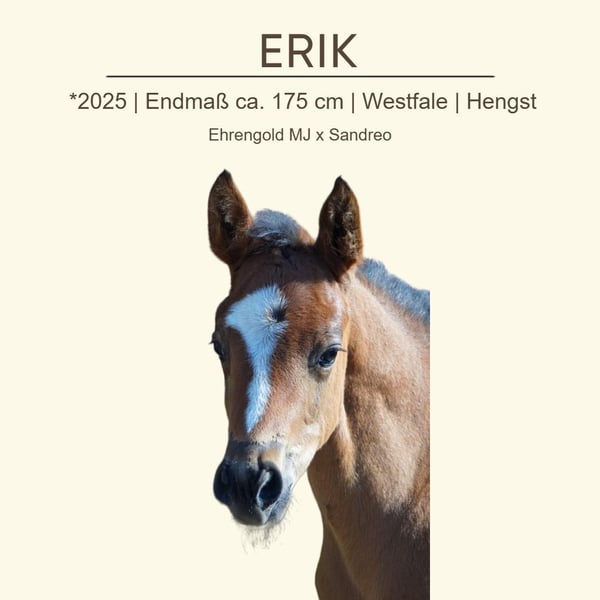 In exzellentem, typischen Erscheinungsbild des Ehrengold MJ ist dieser Hengstanwärter aufgemacht. In natürlicher Aufrichtung trabt ERIK bei guter Selbsthaltung und harmonischer Mechanik in Hinter- und Vorhand. Der bergauf konstruierte Körper rundet das Gesamtbild positiv ab. Ein harmonisches Verhältnis von Beinlänge und Oberkörper und klare Reitpferdepoints zeichnen ihn aus. Die Liste der hocherfolgreichen Sportpferde aus aller engster Familie ist qualitativ und quantitativ erfreulich. Wffs, PSSM 1 und CA frei getestet. ERIK kann ab Herbst 2025 in sein neues Zuhause ziehen!