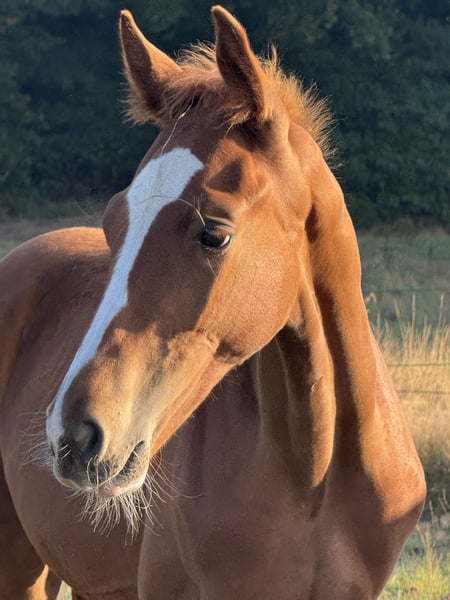 ⸻ Colt foal by For Gold x Londontime x Lanthan Born on April 29, 2025 – Chestnut A strong and expressive colt foal with an outstanding appearance and striking markings – four white-stockinged legs emphasize his elegant presence. This promising foal impresses with light-footed, elastic movement and already shows an exceptionally high willingness to work – true to his sire For Gold, who is known for rideability, strong character, and athleticism. Pedigree highlights: • For Gold: Known for his excellent rideability and modern movement potential. • Londontime: Brings type, elegance, and proven dressage lineage to the line. • Lanthan: Represents established Hanoverian quality, foundation, and reliability. A foal with great potential for upper-level dressage sport and an extraordinary presence – both in the arena and in appearance.