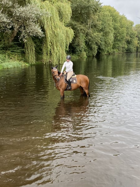 Schweren Herzens verkaufe ich meinen 14 jährigen Wallach auf Grund von Nachzucht. Er ist im Umgang, beim Schmied und Verladen absolut unkompliziert und brav. Besonders viel Spaß hat er im Gelände. Er geht problemlos alleine oder in der Gruppe. In der Gruppe kann man ihn an jeder Stelle reiten und er ist immer gut zu Händeln. Wir hatten ihn bereits 3x mit in der Heide. Er geht ins Wasser und springt kleine Geländehindernisse. Aktuell ist er L Springen platziert und hat A** Springen gewonnen. Beim Springen ist er mit viel „Go“ ausgestattet. In der täglichen arbeitet ist er leichtrittig und bereitet einem viel Freude. Er ist manchmal etwas sensible und daher KEIN Anfängerpferd. Ein super Partner für den ambitionierten Freizeitreiter. Er wird nur in nachweislich allerbeste Hände abgegeben.