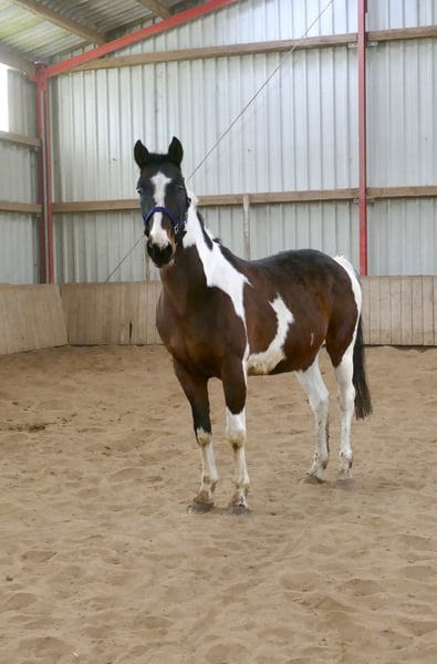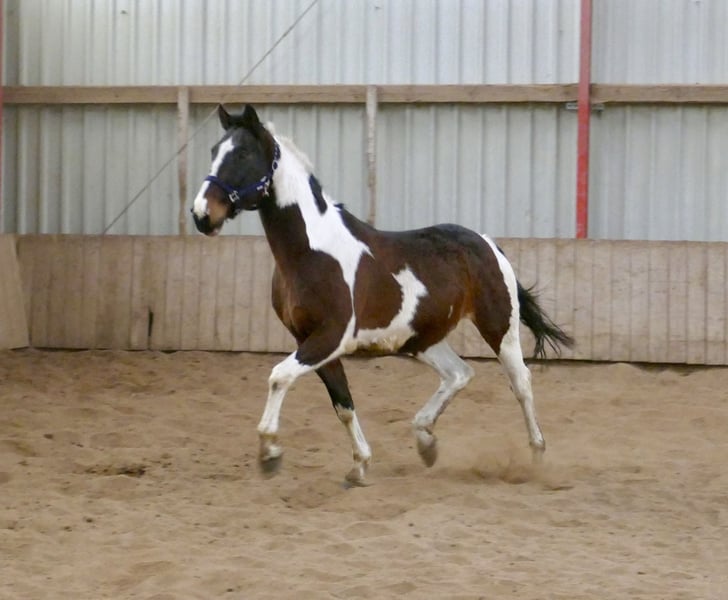 Very handsome 16-year-old pinto gelding by Ismo x Polany x Direx, standing at 16.1 hh. Well-behaved and easy to handle, gets along well with other horses. Due to lack of time, he has not been ridden for a while, so a trial ride is currently not possible. Has always been healthy and sound. Available for leisure riding and as a companion horse.