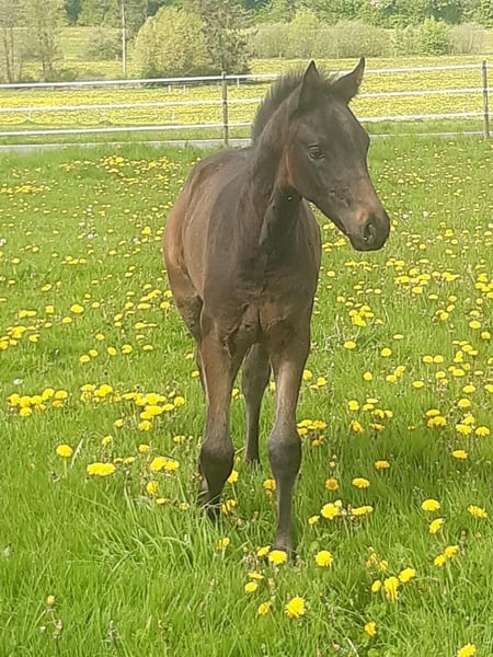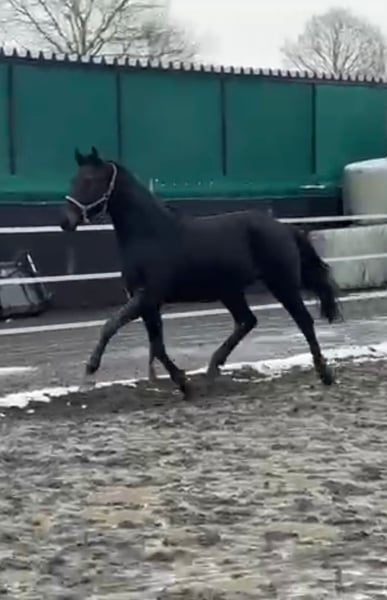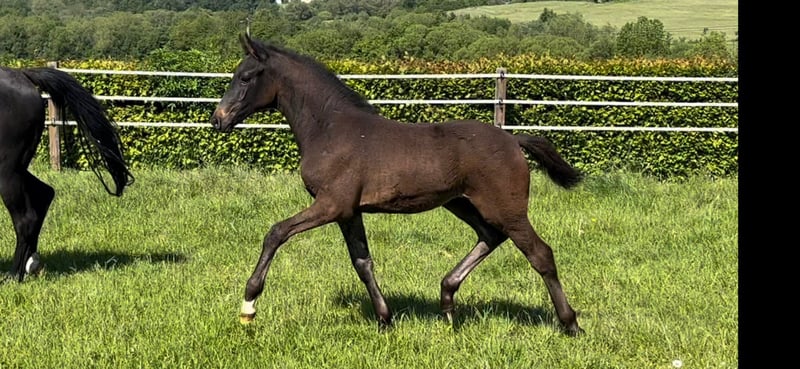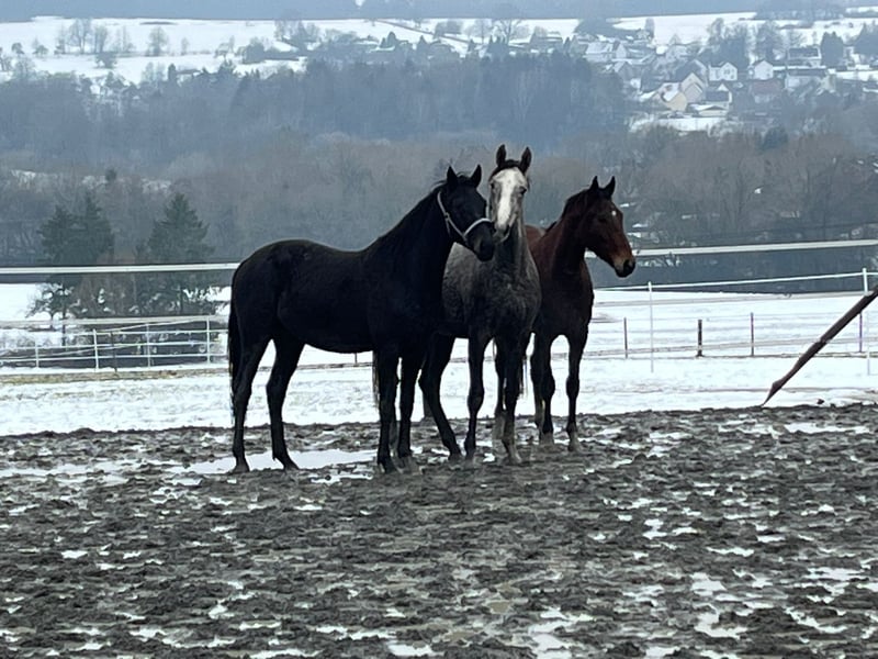 Fred Fantastic is a stunning three-year-old gelding by Fair Deal out of a Quantum Leap x Hohenstein mare. He has been lovingly raised in excellent conditions and has been regularly attended to by the farrier. Fred has three good to very good gaits and moves very fluidly through his body, always engaging his active hindquarters. His hindquarters are reliably inherited from his mother and grandmother, the latter of whom competed at the Bundeschampionat at age six and has become a successful dressage performance mare through her achievements. He currently measures 1.60 meters (approximately 16.1 hh) and has a calm and obedient temperament. He is in training in Elsoff and can be visited there by appointment (his mother, currently in foal to Secret, and his two-year-old sister by Va Bene, can also be seen). We are looking forward to finding a wonderful home for Fred! For inquiries, please contact us at 0176 31079183.