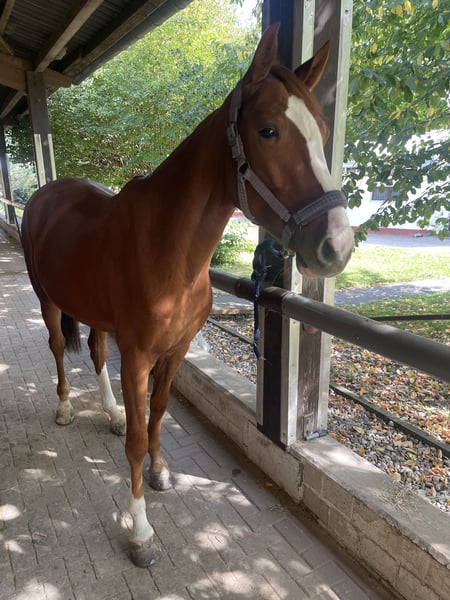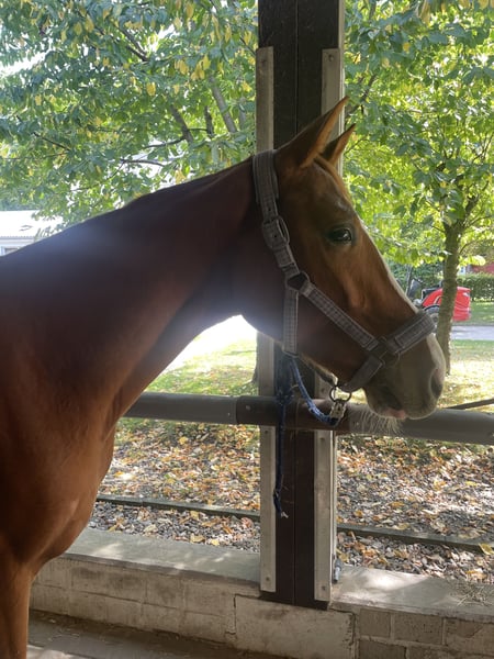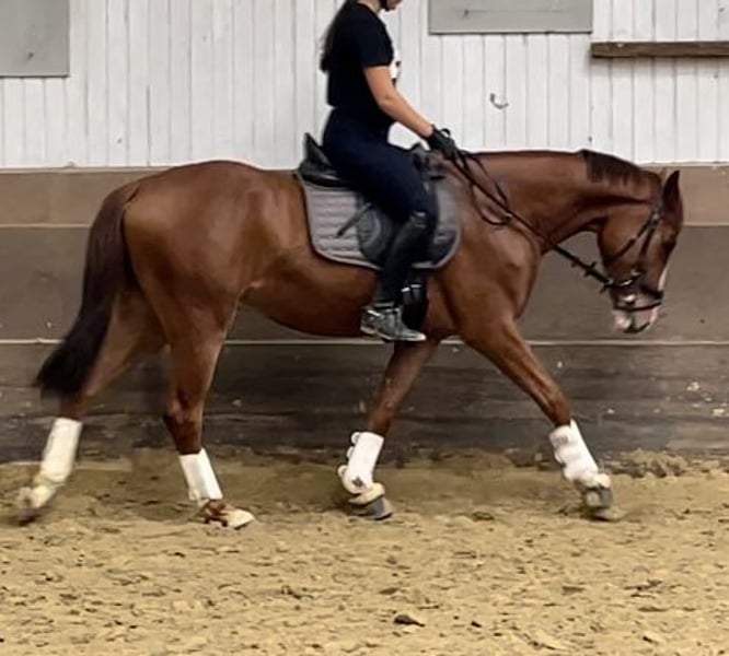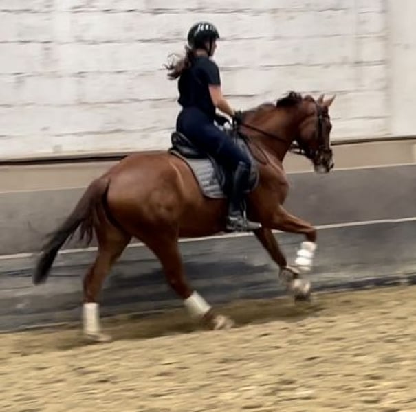 Heartbreaker for sale! 3-year-old chestnut gelding (registered as Dark Chestnut), born March 2022, currently approximately 1.59 m, three outstanding gaits, top dressage pedigree and fantastic character, well-behaved and confident, good in contact. Under saddle since early June and currently in training as a riding horse. He is an ideal young horse for smaller ladies/gentlemen or aspiring riders and has the potential to become a top dressage horse with proper training. More information and videos gladly available upon request via email or phone/WhatsApp. Location: North Rhine-Westphalia (Cologne). Private sale, current price negotiable, price will increase with further training.