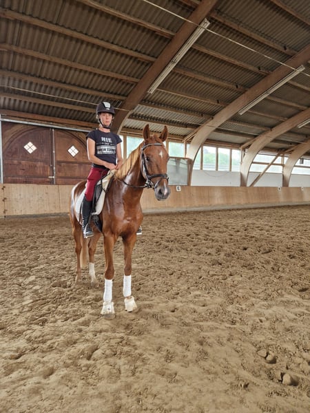 Sold on behalf of the breeder: Four-year-old well-behaved gelding Under saddle for approximately four months Enjoys being ridden in all gaits Ridden regularly by a 12-year-old girl Not yet suitable for complete beginners due to training level He is a rather slender type and not suitable as a weight carrier We envision a mother-daughter pair as a good match for him Familiar with pasture, lunging, and farrier No TÜV available
