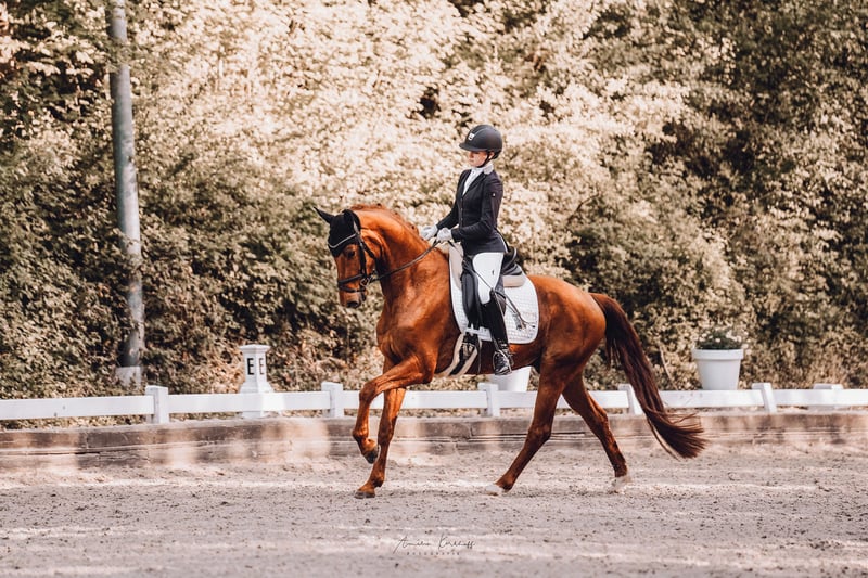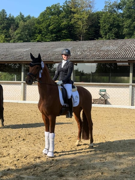 Der vierjährige Sohn des Vitalis aus einer S*** erfolgreichen Damon Hill Mutter ist ein aufmerksamer und immer motivierter Sportpartner. Zuhause haben wir bereits spielerisch den Außengalopp oder ein paar Tritte seitwärts dazu genommen. „Ernie“ lernt sehr schnell und zeigt sich stets arbeitswillig. Auf dem Turnier benimmt er sich wie ein Profi, für den langes Warten am Rande des Abreiteplatzes für die Platzierung kein Problem ist. Auf seinem letzten Turnier konnte er mit einer 7,8 die Richter von sich überzeugen und sich dem zweiten Platz rangieren. Er geht täglich mit seinem Vollbruder „Bert“ auf die Weide oder auf das Paddock.