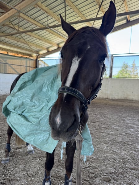 Te koop staat een bijzonder typerijke en expressieve Westfaalse ruin van Baccardis Best x Fürst Romancier in de prachtige donkervachtkleur. Geboren in 2022, is hij nu 3,5 jaar oud en meet al 1,70 m. Mokka overtuigt met drie uitstekende basisgangen die geen wensen onbeantwoord laten: een krachtig, vloeiend drafje, een bergopwaartse galop en een ruimtelijk bewegende stap. Zijn natuurlijke bewegingskwaliteit en talent laten nu al zien dat hem een grote toekomst in de dressuursport wacht. Mokka springt al vliegende wissels aan beide zijden, wat zijn uitstekende balans en leergierigheid onderstreept. Sinds midden dit jaar is hij voorzichtig aangezad en heeft hij al twee dressuurproeven gelopen, waarin hij zich zeer zelfverzekerd en ontspannen presenteerde met cijfers boven de 7. Voor afwisseling springt hij ook wel eens kleine kruisjes en neemt hij regelmatig deel aan een wekelijkse cavaletti-les, die hij met veel plezier en overzicht voltooit. Hij staat echt open voor alles wat men hem aanbiedt en doet alles met plezier mee. In omgang en onder het zadel toont hij een droomkarakter – echt een 10 van de 10! Hij is mentaal al als 20 jaar, altijd kalm, betrouwbaar en absoluut nervenstark. Of er nu 10 andere paarden in de bak zijn, reclamevlaggen wapperen of het kleurrijke vierkantje blijft, hij blijft altijd kalm en bij zijn ruiter. Ook tijdens het buitenritten maken, het laden of op concoursen is hij simpelweg braaf en gemakkelijk. Ondanks zijn leeftijd hoeft hij niet te longeren voor het rijden en heeft onder de ruiter nog nooit een verkeerde voet gezet. Een jonge ruin met een uitstekend karakter, groot hart en bovengemiddelde bewegingskwaliteit – een paard dat elke dag plezier brengt en veelbelovend is voor een toekomst in de dressuursport. Röntgenfoto’s inclusief hals en rug zijn zonder afwijkingen aanwezig. Hij wordt alleen verkocht aan de beste handen. Omdat wij geen recreatief ruitersvervoer ondersteunen, wordt er €30 in rekening gebracht voor proefritten.