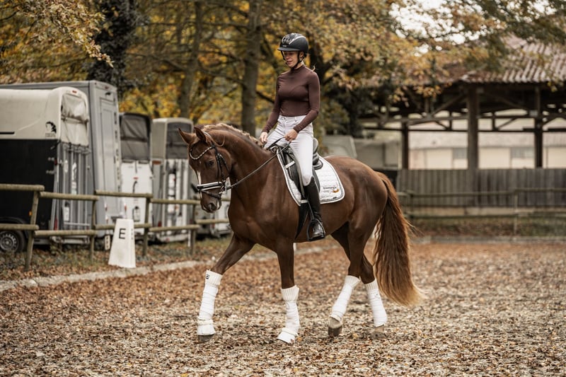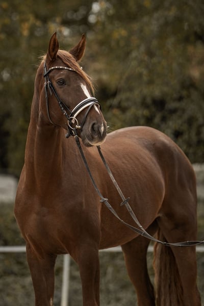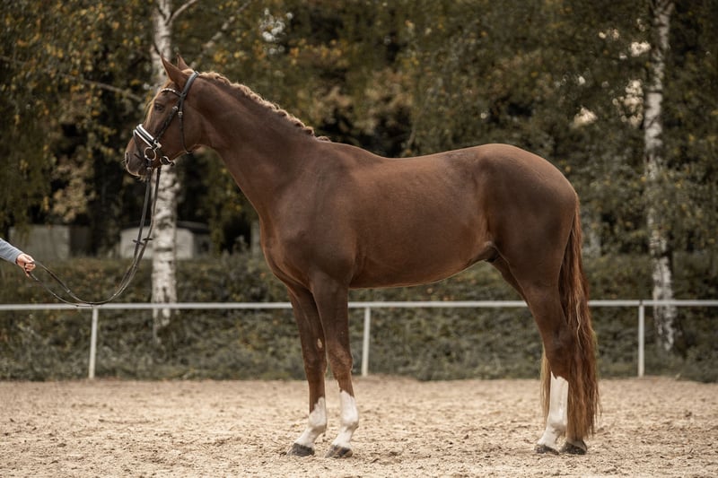 For sale is a particularly typey and expressive Westphalian gelding by Baccardis Best out of Fürst Romancier, in the stunning dark chestnut color. Born in 2022, he is now 3.5 years old and already stands at 16.1 hh. Mokka impresses with three outstanding gaits that leave nothing to be desired: a powerful, elevated trot, an uphill canter, and a spacious, ground-covering walk. His natural movement quality and talent already indicate a bright future in dressage. He is already performing flying changes on both sides, highlighting his excellent balance and eagerness to learn. Since mid-year, he has been gently backed and has already competed in two young horse classes, where he presented himself very confidently and calmly, earning scores above 7. For variety, he also jumps small cross rails and regularly participates in a weekly cavaletti session, which he approaches with great joy and composure. He is truly versatile and eager to please, happily doing anything he is asked. In handling and under saddle, he displays an ideal temperament – a true 10 out of 10! His mindset is mature beyond his years: always cool, reliable, and absolutely brave. Whether there are ten other horses in the arena, banners fluttering, or the colorful cones around, he remains calm and focused on his rider. He is also well-behaved and straightforward when hacking out, loading, or at competitions. Despite his age, he does not need to be lunged before riding and has never taken a false step under saddle. A young gelding with excellent conformation, a big heart, and above-average movement quality – a horse that brings joy every day and promises a bright future in dressage. X-rays of the neck and back are available without any findings. He will only be sold into the best hands. Please note: a €30 fee will be charged for trial riding, as we do not support riding tourism.