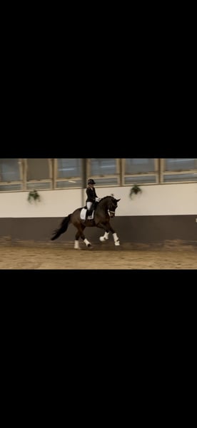 Te koop staat onze ruin Valentin, een hengst van Vivat Rex x Finest, die al meerdere keren succesvol is geplaatst in concoursen voor jonge dressuurpaarden en dit seizoen direct zijn eerste Dressuurpaarden A heeft gewonnen. Hij bevindt zich momenteel op een leeftijdsadequate wijze in verdere opleiding en werkt gemotiveerd aan de oefeningen van L-niveau. Hij overtuigt met bovengemiddeld goede gangen, rijdbaarheid en een positieve werkhouding. Vanwege het stoppen met de paardensport geven wij onze Valentin met pijn in het hart weg. Het is voor ons belangrijk dat hij uitsluitend in goede en passende handen terechtkomt! Gezondheid: Een lichte rugspanning en een kleine Mini-Chip, die volgens meerdere dierenartsen zonder bezwaar is. Klinisch gezien vertoont hij geen afwijkingen. Meer informatie: Bij serieuze interesse en voor meer details kunt u gerust contact met ons opnemen.
