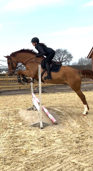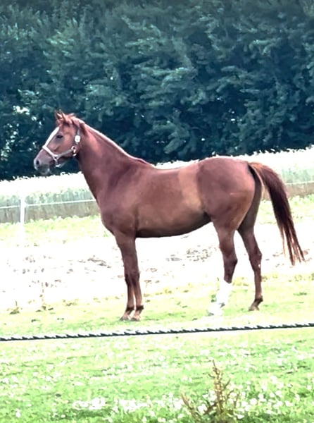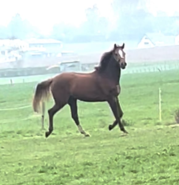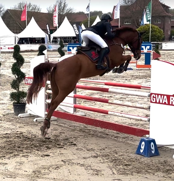 Hickstead White • Cador ist seine Abstammung . Hickstador ist erst im Juli geboren und durfte deshalb vier jährig einen Sommer mit seiner kleinen Schwester auf der Weide verbringen. Ende letzten Jahres ist er dann zum Anreiten gegangen. Ab Februar 2026 hat ihn dann die Johanna übernommen und mit ihm die ersten Sprünge gemacht. Hickstador hat sich seit dem durch seine gute Rittigkeit und seinem extremen Leistungswillen wahnsinnig schnell entwickelt so das er im Mai schon seine ersten Schleifen in Spr.Pf. A** gemacht hat. Jetzt ist er schon die erste L mit einer schönen Runde gegangen und zeigt sich richtig toll. Seine Mutter war anfang sieben jährig gleich im schweren S in Riesenbeck erfolgreich und wurde nur durch eine Verletzung danach Ausfall der Reiterin und zum Schluss noch Corona ausgebremst ein Weltklasse Pferd zu werden. Ich habe selber schwere Gesundheitliche Probleme und habe mich dann entschlossen mit ihr zu züchten. Cadora’s jüngere Schwester ist mit Toni Haßmann auch siegreich in S und auch international siegreich. Hickstador ist ein ganz lieber und total unkompliziert und kann ein großer im Sport werden. Er hat vor dem Anreiten noch einen top Züchter Tüv absolviert.