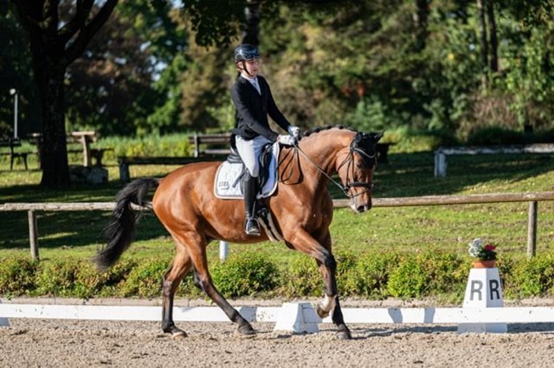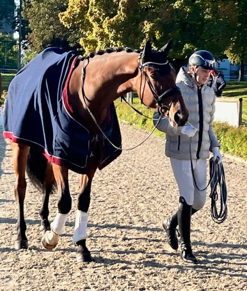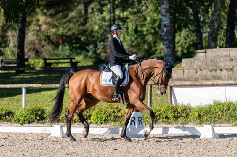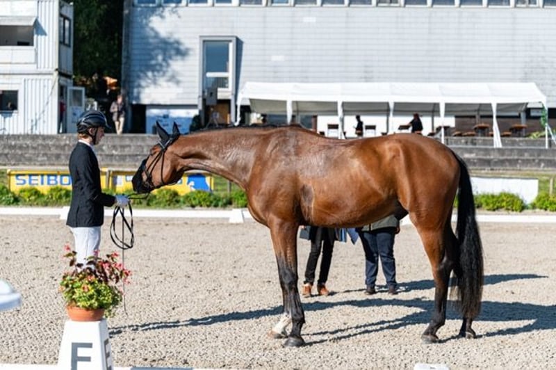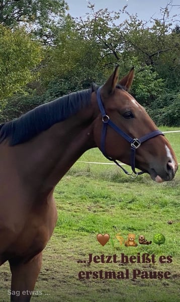 Wir müssen uns leider von unserem 4-jährigen braunen Wallach Sonntag (Secret - Ehrentusch) trennen. Sonntag wurde behutsam angeritten. Von Minute eins war er absolut abgeklärt, immer hochmotiviert und wissbegierig bei der Arbeit und einfach total lieb. Sonntag besitzt drei sehr gute Grundgangarten, ist auf Dressurpferde A-Niveau und zeichnet sich besonders durch seinen liebenswerten und spitzenmäßigen Charakter aus. Sonntag ist Reitpferde platziert. Er ist 1,82 Stm. groß, laut Zigeunermaß wächst er nicht mehr und er ist trotz dieser Größe und der kurzen Zeit unter dem Sattel schon recht ausbalanciert. Er ist absolut nicht triebig, hat noch nie einen falschen Tritt gemacht und möchte es einem nur recht machen. Buckeln unter dem Sattel ist ein Fremdwort für ihn. Er liebt Schmuseeinheiten und würde einem am liebsten in die Manteltasche kriechen – was bei seiner Größe ja leider nicht geht. Ein echter Rohdiamant, der nun auf der Suche nach einem neuen Möhrchen-Geber ist. Er hat einen Befund (Zyste im Knie), der aber seit 2 Jahren unverändert ist. Er steht in der Nähe von Stuttgart. Preis weit unter Wert aufgrund des Befundes. Meldet Euch gerne bei ernsthaftem Interesse per PM. Dann kann gerne ein Video zugesandt werden. 4 yo gelding for sale, 1,82 Stm. He probably will not grow any more, 3 very good gaits and from begin a very excellent character, he is very eager to work, attentive and easy to ride, despite his size and youth quite well-balanced, not spooky, very good manners, never did something wrong and therefore very easy to handle, located near Stuttgart. If you wish further Informations or a video please PN.