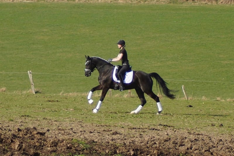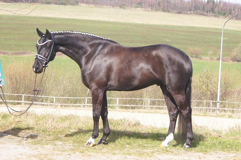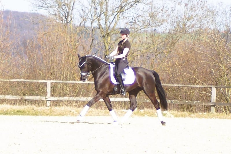 Fiorello is an exceptionally handsome and charming dressage horse, exhibiting a level of rideability and willingness to work that is quite rare. He combines the gentle nature and good contact of the Fürstenball son Finest with the courage and performance drive of Arpeggio. In his third generation, his dam is the mare Danny Doreen, who has already produced a licensed stallion with Let de Lember. She contributes the deep hock angulation necessary for good balance and power development. His three basic gaits are equally well-developed. His walk is very expressive with a secure overstep. In trot, he has a strong hindleg with excellent weight-bearing and good shoulder freedom. Thanks to his excellent conformation, he is easy to collect, which is especially beneficial for less experienced riders. The same applies to his canter: he demonstrates a very uphill canter, always attentive to the rider. Overall, Fiorello can be recommended to anyone. If someone is looking for a relatively young horse, he is the perfect choice. With him, there’s no need to get everything right immediately; he offers many opportunities and always maintains a cheerful attitude. A TÜV report without findings is available, valid until February 2026.
