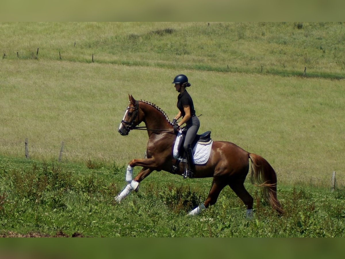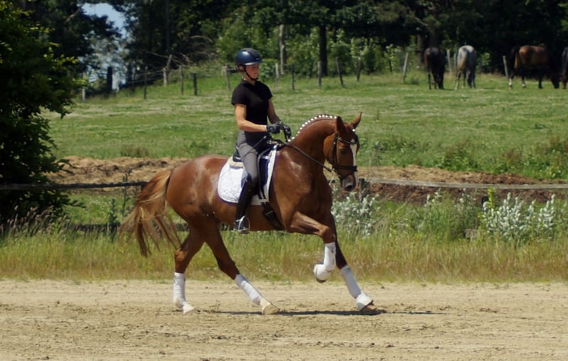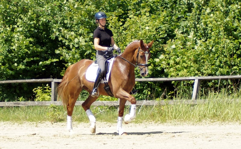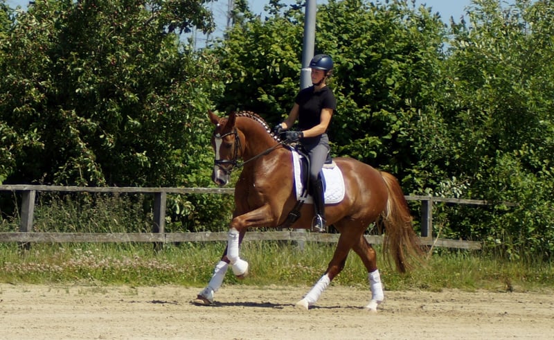Enrico trägt bedeutende Gene in sich. Sein Vater Escamillo war Vizeweltmeister und klettert gerade die Erfolgsleiter über S* und S** herauf. Enricos Mutter machte selber eine Stutenleistungsprüfung mit 8,21 und trägt mit Florencio einen Doppelweltmeister im Pedigree. Diese Gene spiegeln sich auch in Enrico wieder. Ähnlich wie bei seinen Geschwistern Destino und For Infinity ist sein Auftreten erst etwas zurückhaltend. Sobald er weiß, was tun ist, beginnt der Fliegeralarm. Das bei Reitern sehr beliebte Florencioblut sorgt hier für ein kraftvoll, dynamisches Abfussen und wird durch die beeindruckende, elastische Trabmechanik des Escamillo verstärkt. Das schöne Bergauf und die gewaltige Schulterfreiheit demonstrieren auch im Galopp seine besondere Qualität. Mit guter Körperhaltung und auffallendem Rahmen ausgestattet, fällt es ihm schon früh leicht mit seiner Balance zu spielen. Auffallend ist auch seine gute Anlehnung, die er bereits nach wenigen Tagen unter dem Sattel besaß. Insgesamt brilliert dieser Youngster schon früh mit vielen Extras bei hervorragendem Interieur, welches an Westfalens leistungsstarke E-Linie erinnert. Ein guter Tüv aus August 2024 liegt vor.