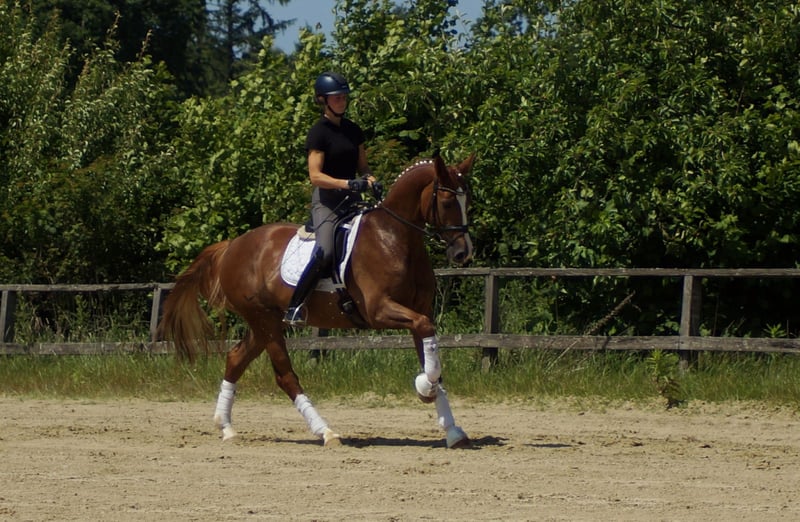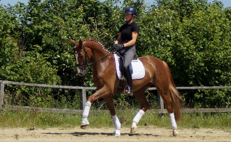 Enrico carries important genes. His sire Escamillo was Vice World Champion and is currently climbing the ladder of success via S* and S**. Enrico's dam herself passed a mare performance test with a score of 8.21 and has a double world champion in her pedigree with Florencio. These genes are also reflected in Enrico. Similar to his siblings Destino and For Infinity, his demeanor is somewhat reserved at first. As soon as he knows what to do, he starts to fly. The Florencio bloodline, which is very popular with riders, ensures a powerful, dynamic downhill movement and is reinforced by Escamillo's impressive, elastic trotting mechanics. The beautiful uphill movement and enormous shoulder freedom also demonstrate his special quality in canter. Equipped with good posture and a striking frame, it is easy for him to play with his balance from an early age. His good contact, which he already has after just a few days under saddle, is also striking. All in all, this youngster shines early on with many extras and an outstanding interior reminiscent of Westphalia's E-line.