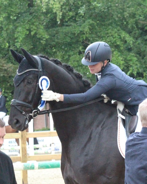 Scottish Peat – een glanzzwart reus met een hart van goud Scotty is een indrukwekkende, grootgebouwde ruin met een echte uitstraling – en tegelijkertijd een paard dat je meteen in je hart sluit. Ondanks zijn XXL-formaat is hij zeer fijn te rijden, gevoelig aan de hulpen en altijd eerlijk in de omgang. Hij komt rechtstreeks van de fokker en is een zoon van de Hannoveraanse dressuurkampioen Spökenkieker, uit een zeer succesvolle merriestam. Een goede röntgenkeuring is vanzelfsprekend aanwezig. Vanwege stembandcorrectie met korting. Sportief heeft Scotty al overtuigd: meerdere malen hoog geplaatst in rijpaarden- en dressuurwedstrijden op klasse A-niveau. Hij is momenteel L-bereden en kent al buitenwaarts galopperen, eenvoudige wissels en kortkeert – altijd gemotiveerd, eerlijk en leergierig. Scotty houdt van afwisseling: buitenritten (volledig buitenrijveilig), stangenwerk, springen, vrijspringen, grondwerk of gewoon uitgebreid knuffelen – hij staat voor elk plezier open en doet altijd met plezier mee. Zijn zachte, liefdevolle aard maakt hem tot een heel bijzondere partner die zijn mens graag wil gefallen. Een uitzonderlijke, glanzzwarte dressuurafstamming met veel hart, kwaliteit en perspectief – voor ruiters die op zoek zijn naar een groot paard met een groot karakter.