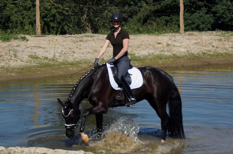 Fiorino is a top-class dressage horse that enjoys what humans offer him. Equipped with exceptional basic gaits, this strikingly beautiful gelding draws many eyes. His walk is large and very efficient. In the trot, he has a good hind leg that translates into expression and mechanics with plenty of shoulder freedom. His canter is maximally constructed uphill and gains significant importance from the enormous shoulder freedom. Personally, he is completely indifferent to this. He is only surprised by the many spectators, as he enjoys it when the rider fiddles with him, new tasks arise, or he simply gets to experience something. His riding reflects much of the Fürstenball bloodline. The way he moves softly and dynamically with a very pleasant contact can be attributed to his sire, Finest (by Fürstenball). Through the maternal line, which is also known for its jumping performance, he inherits a good physique with strong hind legs and a willingness to perform. Overall, one would today describe him as an expressive, extremely likeable "triple gaited" horse (three good basic gaits), whose future looks very promising due to a successful genetic foundation. A good TÜV from May 2025 is available.