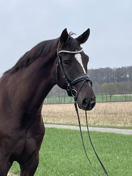 Zum Verkauf steht dieser sechsjährige Wallach von Finnigan aus einer Damon Hill Mutter in begehrter Dunkelfuchsjacke direkt vom Züchter. Aus dem direkten Mutterstamm sind bereits Grand Prix Pferde hervorgegangen. Die Mutter Donna Castania ist auch Großmutter zum Bundeschampion For Real. Wie all unsere Verkaufspferde ist dieser sympathische Wallach bei uns geboren und wurde aufgrund seiner Größe vierjährig angeritten und schonend aufgebaut. Finni zeichnet sich durch seine hervorragende Rittigkeit mit angenehmem Vorwärtsgo und leichter Anlehnung aus. Er ist ein grundehrliches, sensibles Pferd, welches einen gefühlvollen Reiter mit Spaß an der dressurmäßigen Arbeit sucht. Bei weiteren Fragen melden sie sich gerne telefonisch unter 0170 7741957.