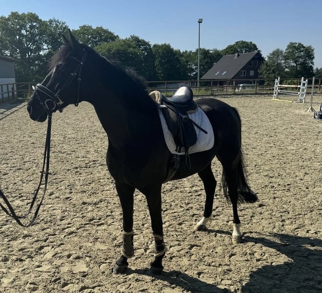 We are looking for a loving home for our 8-year-old gelding (approximately 16.1 hh). He is farrier- and loading-safe, completely well-behaved in handling, and a real eye-catcher. The gelding was bred by us and gently backed. Unfortunately, due to a significant back issue (Kissing Spines), he is no longer suitable for riding. He makes an excellent companion horse – easy to handle, socially compatible, and happy to have company. We are giving him away to a wonderful home where he will receive the attention and care he deserves. In the video, he is the left horse. Please only serious inquiries. Contact only via mobile phone: +49 170 5361075