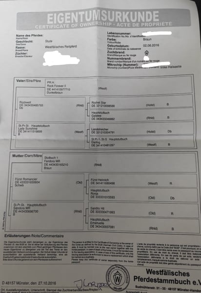Cavalla di 9 anni, alta circa 175 cm, ben allevata con un pedigree che parla da solo. (Rock Forever x Fürst Romancier). Un'andatura estremamente dinamica e fluida, unita a un eccellente esteriore, rendono questa cavalla un vero e proprio colpo d'occhio. Iscritta nel libro delle fattrici del Westfalia. Per il pedigree completo, si prega di fare riferimento al certificato di proprietà allegato. Il trasporto può essere organizzato. L'ispezione veterinaria per l'acquisto può essere effettuata anche dal vostro veterinario, inclusi raggi X e analisi del sangue. Non vediamo l'ora di ricevere la vostra chiamata al numero 015172059610. Le richieste scritte non verranno risposte.