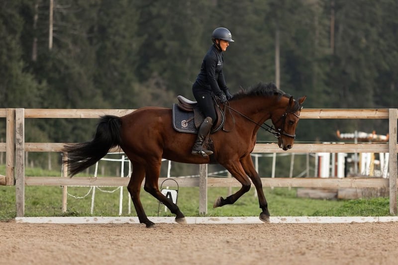 Cayetana, whom we call Caya, is a very gentle and uncomplicated mare. She is willing to participate in everything, whether it's solo or group rides, dressage, lunging, groundwork, or riding without a bridle. She is also extremely nice with children. She is very social with other horses, which is why it is important to us that she continues to have social contact. She lives with a mixed group of three other horses in an open stable. She was previously a show jumper (also with a junior rider), but was retired from sport due to suspensory ligament inflammation and came to us for convalescence and rehabilitation. She is being ridden again but is not intended to return to competition. Maintaining her health through continued training is very important to us, including tensegrity training, biomechanically correct movement patterns, and supportive therapies. She has not undergone a comprehensive pre-purchase exam yet due to her rear leg irregularities, which is reflected in the lower purchase price. She is completely well-behaved when loading (alone or with other horses) and when visiting the farrier. Caya is looking for a dedicated person; she offers a versatility rarely seen and is a wonderful partner for rides, dressage training, and groundwork in all disciplines. Overall, a cool amateur horse for having fun!