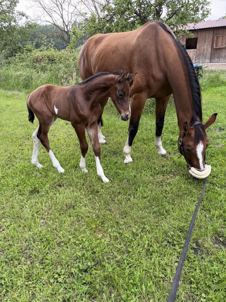 This mare impresses with her charming character and appealing appearance. She has proven herself in the past in both show jumping and breeding, showing a lot of potential. Unfortunately, due to a pasture injury, I had to take her out of sports. She was born in 2009 and stands 168 cm tall. Currently, she has a wonderful colt at her side, and she will be available for relocation at the end of the year. In the meantime, I will cover the costs, but the mare could be bred for 2026 now. She has already produced several award-winning foals. If you are interested or need further information, please feel free to contact us.