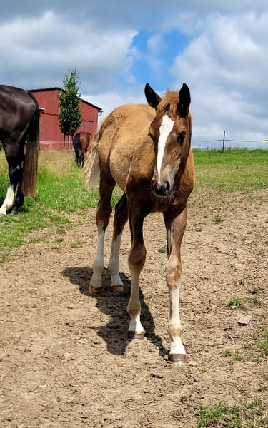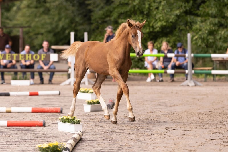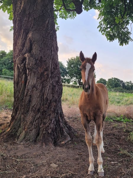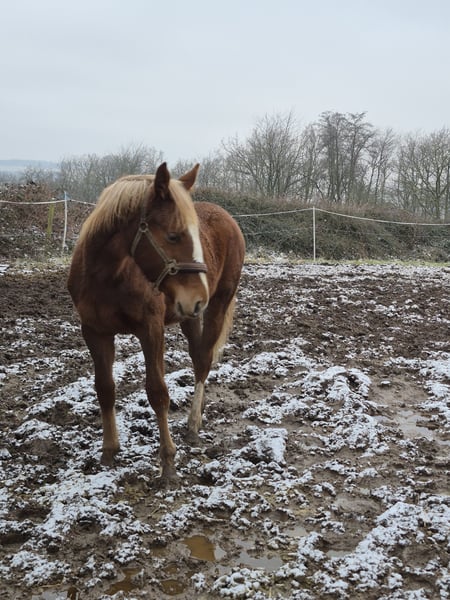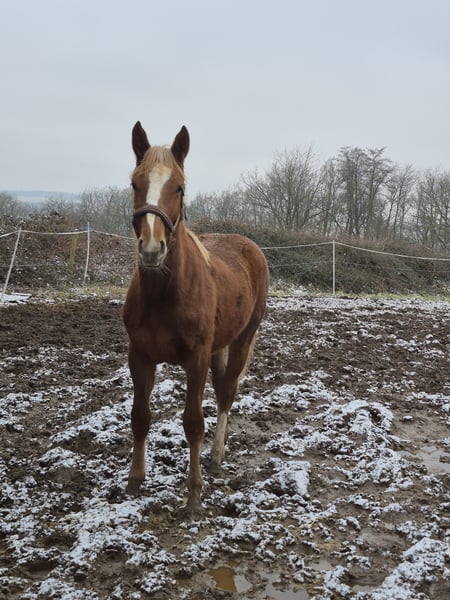 Tilda ist eine aufgeweckte sehr zutrauliche Jährlingsstute. Sie ist bei uns geboren und artgerecht in einer gemischten Herde aufgewachsen. Farblich hat sie sich interessant entwickelt. Sie könnte zum Dunkelfuchs werden. Die blonde Mähne und Schweif sind definitiv jetzt schon ein Hingucker. Sie steht auf einem sehr guten Fundament und ist auch ansonsten absolut korrekt im Körperbau. Sie ist sportlich, kompakt und sehr gut bemuskelt. Tilda hat solide Grundgangarten. Ihre Passion wird sie aufgrund der Abtammung (Tobaro x Zambesi × Grannus) im Springsport oder aufgrund ihrer tollen Art auch als gehobenes Freizeitpferd finden. Das Fohlen ABC kennt sie, ebenso das Anhängerfahren (bisher noch nicht allein). Den Hufschmied hat sie regelmäßig besucht und war auch dabei sehr brav. Sie ist kerngesund, regelmäßig entwurmt und Tetanus geimpft. Tilda wird aufgrund der Aufgabe der Pferdezucht und des Pferdesports in verantwortungsbewusste Hände abgeben. Sie kann gerne bis zum Beginn der Weidesaison bei uns bleiben! Ernstgemeinte Anfragen bitte mit Angabe einer Telefonnummer.