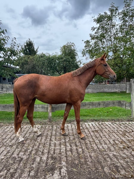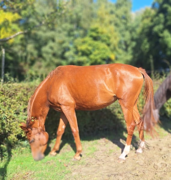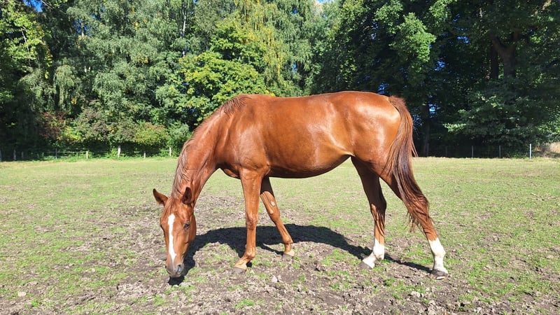 **Sales Advertisement: Beautiful Westphalian Mare for Sale** For sale is a Westphalian mare, born in 2022. This pretty chestnut mare stands at 157 cm. She has not yet been backed, as she was born at the end of June and is ideal as a pony transition horse. She is a very fine horse with a very good walk. She has never been sick, but a chip was diagnosed on her left hind leg during a random finding at a vet check, which does not cause any problems. Due to this finding, she is being sold well below value! She was born at our home and lives in a loose housing system in a mixed herd, but is also familiar with box housing. She is accustomed to dogs, trucks, tractors, etc. She impresses not only with her attractive color but also with her friendly and open nature. The mare is well-mannered, easy to handle, and shows a high willingness to learn. If you are interested or need further information, please feel free to contact me. Viewings are possible by arrangement. We look forward to your message!