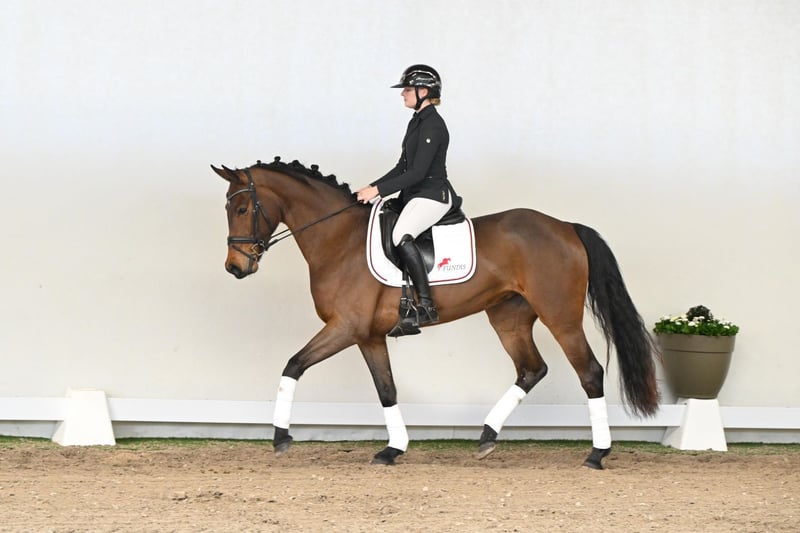 This charming four-year-old filly captivates with her friendly nature and natural calm, making her a true heart horse. With three solid gaits, refined handling, and a balanced temperament, she proves reliable and cooperative in her daily work. Still in the midst of her development, she has all the qualities to evolve into a modern top-level dressage horse. Her pedigree combines the finest lines of German dressage breeding: her sire, Sir Escolar, premium stallion and a prime example of elegance and quality, impresses with outstanding movement, spectacular trot, expansive walk, and expressive canter. The dam’s sire, Zoom, Westphalian dressage reserve champion, contributes excellent gaits, exceptional shoulder freedom, and swinging, ground-covering movement. Fürst Piccolo, as the dam’s dam sire, completes the pedigree, renowned for his remarkable character, outstanding offspring, and unmistakable dressage quality. This filly presents as a harmonious, willing-to-learn horse with natural self-carriage, uphill movement, and a rideability that makes every session effortless. From the first moment, she offers joy, confidence, and the chance for any rider to showcase her quality. A horse for those seeking a promising young dressage prospect with character, three strong gaits, and natural presence – ready to grow into a true champion.