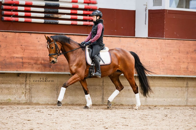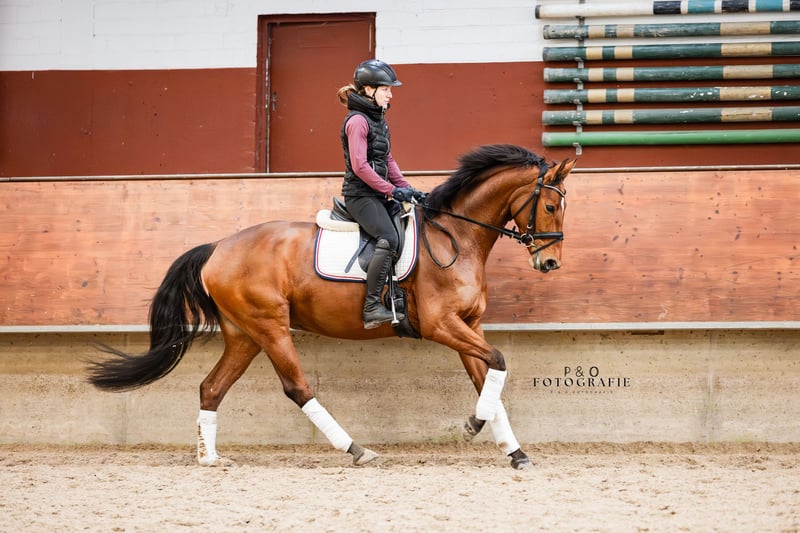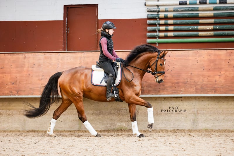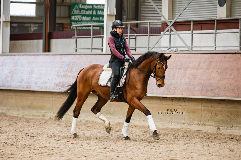 Suki is a promising dressage prospect with excellent movement dynamics and three outstanding basic gaits. She is energetic and forward-moving, with sensitivity and finesse in her aids, yet always well-behaved and completely free of spookiness or nervousness. She is rideable, seat-sound, and possesses the necessary 'speed' within her gait, despite her abundant momentum. Her hind leg is particularly impressive. Suki has already experienced the competition atmosphere and has placed in A-level dressage tests. She is completely unspoiled by her breeder and is ready for the big arena; further training will pay off and bring her much joy. Viewing and falling in love is highly recommended! A recent TÜV report from 01/2025 is available, including her neck, and Suki is EVCM-free.