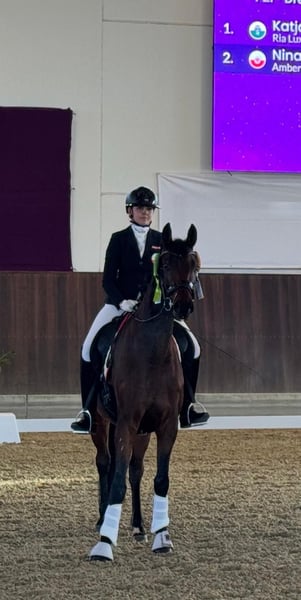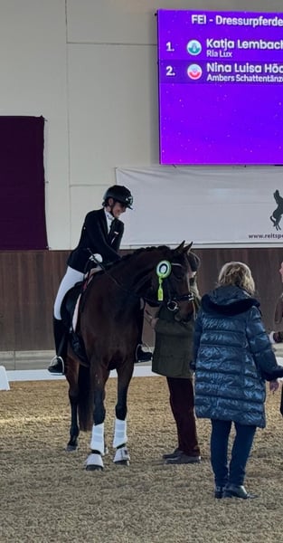 Zum Verkauf steht unsere 4-jährige, selbst angerittene Stute Ria Lux. Wir geben sie schweren Herzens ab, da wir aktuell einfach zu viele Pferde im Stall haben und für sie ein passendes Zuhause suchen, in dem sie individuell gefördert wird. Ria überzeugt mit einem herausragenden Charakter, bester Rittigkeit und viel Vertrauen zum Reiter. Trotz ihres jungen Alters zeigt sie sich stets zuverlässig, gelassen und lernwillig – egal ob auf dem Reitplatz, in der Halle oder im Gelände. Sie verfügt über drei sehr gute Grundgangarten, eine angenehme Anlehnung und ist weich zu sitzen. Ihre Leichtrittigkeit und ihr ausgeglichenes Wesen machen sie zu einem angenehmen Partner im täglichen Training. Ria bringt alles mit, was man sich von einem modernen Sportpferd wünscht, und hat das Potenzial, sich mit entsprechender Förderung im Turniersport weiterzuentwickeln. Auch für ambitionierte Amateurreiter ist sie aufgrund ihres unkomplizierten Charakters bestens geeignet.
