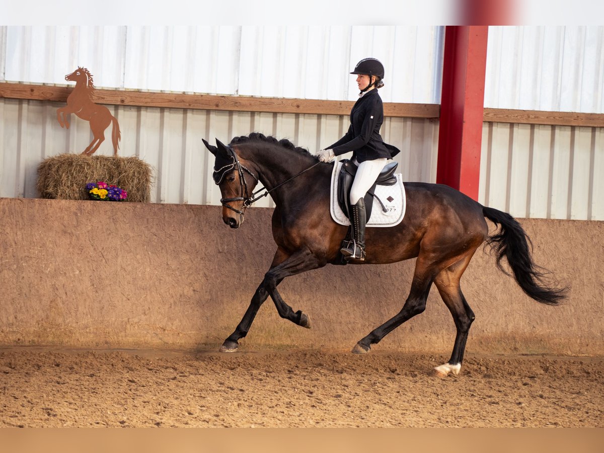 For sale: the promising mare Rock my Heart, aged 4 and standing 17.2 hh. Offered at a favorable price due to a dermatitis issue. With her distinguished pedigree, she combines two proven lines of modern dressage horse breeding: Her sire, Rock Forever NRW, was himself a Bundeschampion, multiple medalist at the World Championships for young dressage horses, and successful up to Grand Prix level. He is considered one of the most rideable and consistent sons of Rockwell, and his offspring are known for their performance in both sport and breeding. His progeny are characterized by high movement quality, strong character, and athleticism — qualities that Rock my Heart already demonstrates impressively. On the dam’s side, she descends from the well-established Rotspon, a son of Rubinstein I, who has long been regarded as a stallion of stamp quality for rideability and reliable inheritance. Rotspon is renowned for producing offspring with excellent riding qualities, an outstanding walk, and natural self-carriage. He has sired numerous successful dressage horses competing at national and international levels. With this lineage, Rock my Heart offers a combination of dynamism, movement strength, and rideability — an ideal foundation for a career in dressage. Her potential was recognized early on: she was awarded as a champion foal. Under saddle, she now confirms these high expectations. Since June 2025, she has been in professional training, showing herself to be easy to ride, eager to learn, and steady-minded. She already impressed in her first young horse class. Rock my Heart impresses not only with an excellent pedigree and quality but also with a friendly, cooperative character. She is an ideal partner for ambitious riders seeking a young horse with prospects for high-level sport. Rocky is already familiar with trail riding, training away from home, etc., and is always reliable and well-behaved, everywhere and at any time. *A fee of 45.00 EUR will be charged for a trial ride.* *The price will increase with further training.*