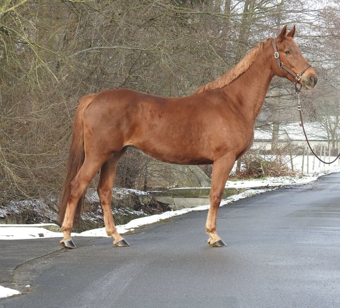 Please note that due to the high volume of inquiries, we kindly request only phone calls. For sale is a 7-year-old chestnut mare with an approximate height of 1.63 meters. The mare comes directly from the breeder, was briefly backed at age 4, and has since been kept for breeding out of personal interest. We would describe her character as very balanced and clear-minded; she remains well-behaved and uncomplicated even in new situations. Due to a reduction in herd size, she was not bred this year and has now been sold. We do not send videos of our horses without prior phone contact, so please refrain from requests such as "please send video." Viewings are possible at any time. For further questions, please feel free to contact us by phone at 0171 530 33 40. All rights to the images belong to Sport- und Freizeitpferde Wilfried Oestersandforth. Distribution or publication is strictly prohibited.