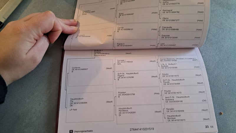 Cleo is a sweet and friendly mare. She will be seven years old in 2026 and stands approximately 1.64 meters tall. At the age of four, she had a very talented foal by Classico's Champion. She was bred successfully after only two inseminations. The pregnancy and foaling were uncomplicated. Sire: Contendrix (placed up to 1.60 m under Toni Hassmann) Dam's sire: Cordynox (placed internationally under Marcus Ehning) Her maternal half-brother is already competing successfully in show jumping up to L and L-Springen levels. At five years old, Cleo was gently backed and started under saddle. She rides calmly alone and in a group in the terrain and happily jumps small courses. She is easy to handle with the farrier and for clipping. She is loading well into the trailer. Cleo is familiar with both box and pasture keeping. Due to an accident in the pasture at age two, Cleo lost her right eye. I am therefore offering her below market value. She copes very well with her loss. Cleo is located in 51647 Gummersbach and can be visited and tried under saddle there. However, to be fair to the horse and avoid riding tourism, I charge a fee of €10 for a trial ride. If interested or for questions, please contact me via ehorses or WhatsApp at 0171 800 89 79. Cleo needs a dedicated person and will not be sold to riding schools or dealers. Priority goes to the right home!