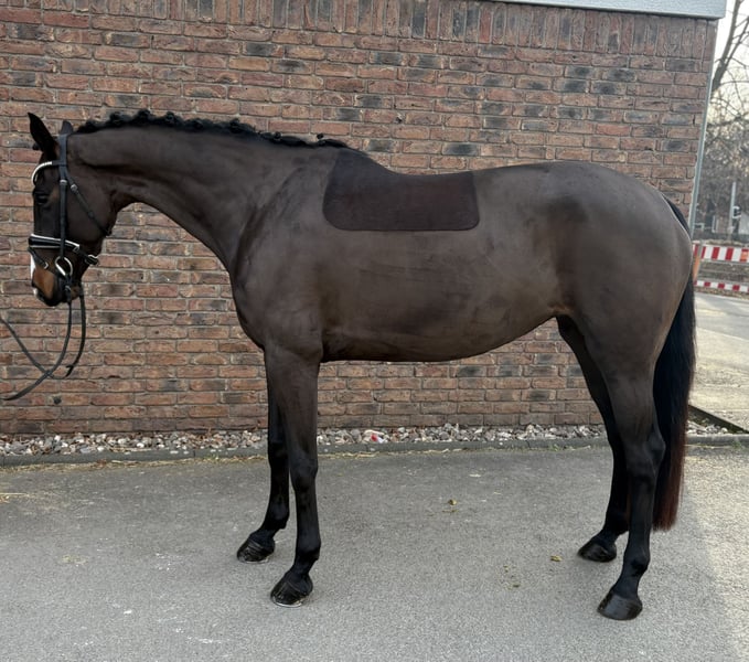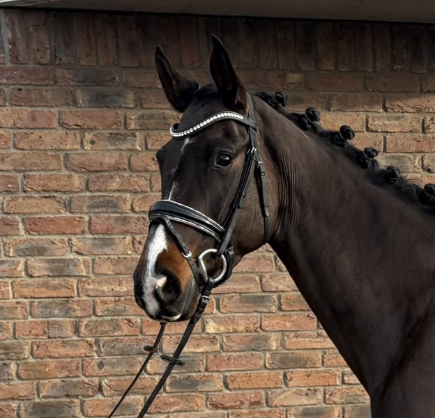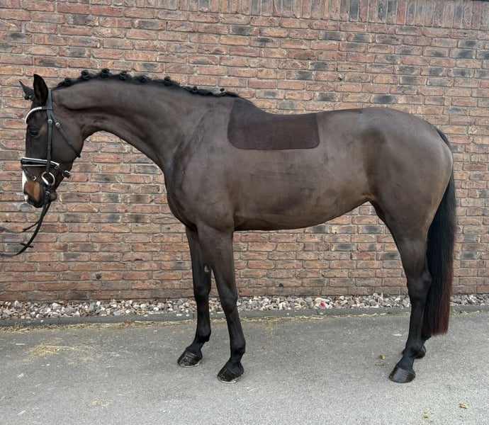 Zarah Leander was trained by an amateur rider and has competed in dressage tests at classes A and L. She is now in professional training and has achieved placements in dressage L. She is familiar with both open stable and box stall management. The mare moves easily on the bit and is comfortable to sit, although she can be somewhat watchful. She is well-behaved but not suitable for beginners. The mare has a current health certificate and no clinical issues were found. X-rays revealed three chips and mild hock cartilage ossification. An insurance covering surgery could be arranged.