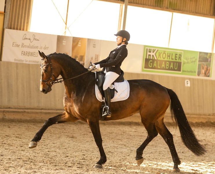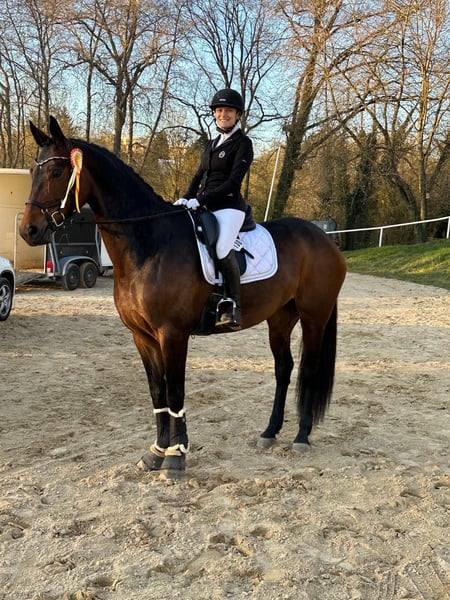 Ich biete meine 8jährige Stute Rose Mary zum Verkauf als Freizeitpferd oder für die Zucht an einen Bestplatz an. Rosi wurde von mir dreijährig schonend und abwechslungsreich ausgebildet und bis zur Klasse L in der Dressur siegreich vorgestellt. Im Springen wurde sie bis Klasse A vorgestellt. Rosi ist ein braves und gehorsames Pferd und bereitet stets Freude. Sie ist sehr leicht im Maul und der Anlehnung. Sie geht alleine ins Gelände, lässt sich alleine verladen, steht artig beim Schmied und kennt Koppelgang in der Herde. Meine Turniere oder sonstige Ausflüge habe ich mit ihr in der Regel alleine gemacht. Von Verladen über Ausladen, fertigmachen und reiten ist alles alleine möglich. Rosi hat allerdings zwei Handicaps. Zum einen steht sie bodenweit, ihre Vorderhufe zeigen beide etwa 30-45 Grad nach außen. Röntgenologisch unauffällig. Fünfjährig hatte sie eine Hufgelenksentzündung, welche ich sehr früh bemerkt und behandelt habe. Seitdem habe ich das Springen auf Gymnastik oder vereinzelte Sprünge reduziert und keine Probleme damit. Ich habe allerdings Pflege der Hufgelenke betrieben, gerne mehr dazu in einem persönlichen Gespräch. Das zweite Handicap zeigte sich nun nach meiner Schwangerschaft. Rosi hat an zwei Stellen im Rücken Engstände der Dornfortsätze. Diese habe ich nie bemerkt, jetzt allerdings durch meine reiterliche Pause eben doch. Rosi lief die letzte Saison erfolgreich in A und L mit einer jungen Reiterin und zeigte nun erst im Winter diese Problematik. Der Rücken ist behandelt und bei richtigem Training sollte er auch keine Probleme machen. Training, für das ich leider keine Zeit mehr habe und ihr dadurch nicht mehr gerecht werden kann. Ich wünsche mir für Rosi ein Zuhause, bei dem sie die Nummer 1 ist. Abwechslungsreiche, rückenfreundliche Arbeit, Weidegang, idealerweise Paddockbox und ein pferdegerechter Umgang wären mir wichtig. Aufgrund ihrer Abstammung Rock forever x Benetton Dream auch für die Zucht vorstellbar. Gerne bin ich telefonisch für Sie erreichbar und beantworte alle Fragen zu Rosi. Kein Notverkauf, nur in beste Hände abzugeben! Ein Probereiten ist gegen eine Gebühr von 50€ möglich.