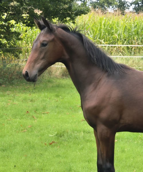 Wunderschönes Stutfohlen aus 04/25, groß gewachsen und super artig. Wächst im Herdenverband auf. Hat wunderbar Schwungvolle GGA mit guter Stabilität. Ganz klassisch in der Farbe, komplett dkl. Braun ohne Abzeichen. Kennt selbstverständlich das Fohlen ABC mit Halftern, leichtes Führen, Putzen, Hufschmied, Wurmkur. Vater Felissimo ist mit seinen 9 Jahren unter Anja Wilimzig, mittlerweile erfolgreich in Dressurprüfungen der Klasse S, St. Georg Spezial, unterwegs. Sein Vater Franziskus war eins der Erfolgspferde in der Dressur ( Grand Prix Spezial, S****, CHIO Aachen etc) mit Ingrid Klimke. Muttervater Cennin war 2018 einer der Top 50 Dressurpferde der Welt ( Platz 21) im WBFSH Ranking. Auch 2025 macht er weiter auf sich aufmerksam unter seiner Reiterin Dania Gschwind-Widmer(Taiwan). In Görlitz platzierten sie sich an 5ter Stelle in einer FEI Intermediaire I und Prix St. Georges. Desweiteren führt die Mutter wertvolles und vorallem sehr haltbares Blut über Biotop × Pit I × Pazifik. Wie führen eine kleine, sehr liebevolle Zucht wo wir dieses Jahr dieses tolle Stutfohlen anbieten möchten. Sie ist täglich am Menschen und somit sehr zutraulich und verschmust. Das Fohlen kann fast täglich persönlich angesehen werden. Ein Fohlentüv ist schon erstellt, ohne Mängel. Dieser kann natürlich jederzeit aktuell gemacht werden. ✨ Hinweis zum Preis: Der Preis ist fair und mit Bedacht gewählt – schließlich steckt viel Herzblut, Zeit und Liebe in der Aufzucht. ❤️ In der Anzeige wird er daher nicht weiter reduziert. Bei einem persönlichen Gespräch finden wir aber bestimmt eine Lösung, mit der beide Seiten zufrieden lächeln – und das Fohlen in die richtigen Hände kommt. 🐴