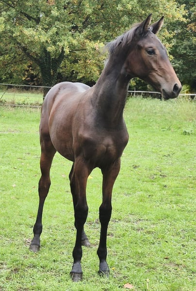Beautiful filly born in April 2025, tall and very well-behaved. She is growing up in a herd environment. She has wonderful, powerful gaits with good stability. Classically colored, completely dark brown without any markings. The foal is familiar with the basics, including haltering, leading, grooming, deworming, and hoof care. We run a loving small private breeding operation, and this year we would like to offer this amazing filly. Currently, there are no additional videos available. The foal can be viewed in person almost daily. If you have any further questions, please feel free to contact us.