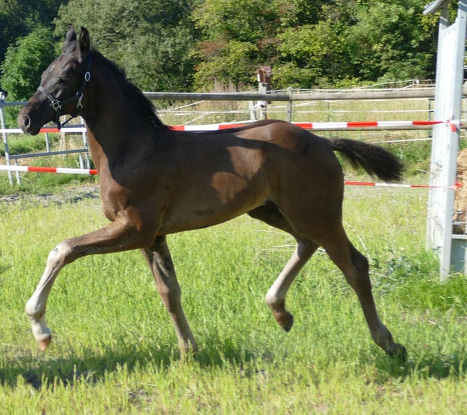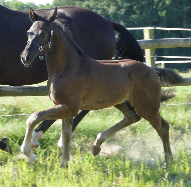 Stunning, well-developed bay filly foal by the premium stallion San Vermeer out of a premium mare by Dante Weltino. The dam has a licensed son by Fahrenheit, now successfully competing at S-level, and a full sister who recently won S* in London just a few weeks ago. This foal boasts three consistently excellent conformation traits, an outstanding hind leg, and very good front-end movement. Secure this black beauty now – you'll stand out positively everywhere with her. Videos are gladly sent via WhatsApp; please request at 0171-4720209.
