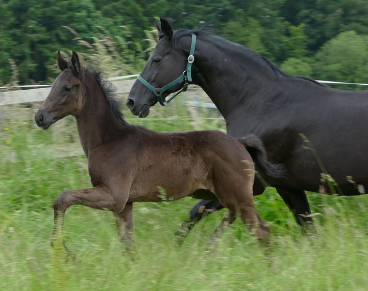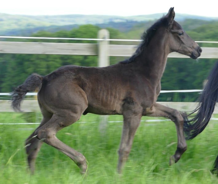Bildschönes, sehr gut entwickeltes Rappstutfohlen vom Prämienhengst San Vermeer aus einer Prämienstute von Dante Weltino. Die Mutter hat einen gekörten Sohn von Fahrenheit, inzwischen S-hoch erfolgreich und eine Vollschwester dazu, die vor wenigen Wochen in London S* gewann. Das Fohlen verfügt über 3 gleichmäßig sehr gute GGA bei erstklassigem Hinterbein und sehr guter Vorhandaktion. Sichern Sie sich diesen Traum in schwarz, Sie werden damit überall sehr positiv auffallen. Videos werden gerne per whattsapp verschickt, bitte unter 0171-4720209 anfordern