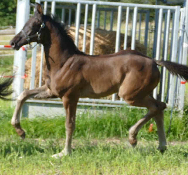 Przepiękna, bardzo dobrze rozwinięta klaczka urodzona z prestiżowego ogiera San Vermeer oraz matki od Dante Weltino. Matka ma licencjonowanego syna od Fahrenheita, który jest już na poziomie S i odnosi sukcesy, a także pełną siostrę, która kilka tygodni temu wygrała konkurs S* w Londynie. To źrebię wyróżnia się trzema równymi, bardzo dobrymi potrójnymi ocenami (GGA), doskonałym tylnym kończynami oraz bardzo dobrą akcją przednich kończyn. Zabezpiecz sobie tego czarnego pięknego konia – z pewnością wyróżnisz się nim wszędzie pozytywnie. Chętnie wyślę filmy przez WhatsApp; proszę o kontakt pod numerem 0171-4720209.