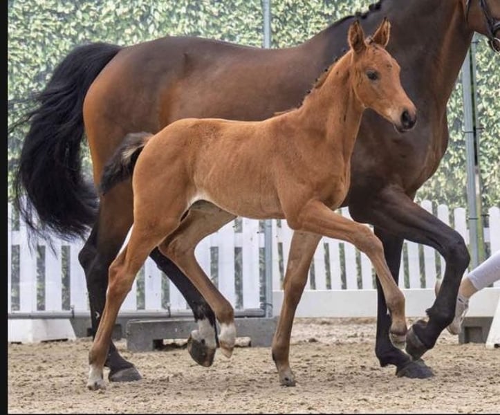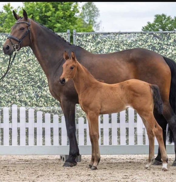 Tolles Stutfohlen vom aktuellen Bronzemedaillen- Gewinner der Jungpferde- WM Endorphin FRH aus einer Verbandsprämienstute von Foundation x Prestige Pilot. Dieses Fohlen stammt aus einem hocherfolgreichen Hannoveraner Stutenstamm. Vollbruder zur Mutter ist erfolgreich bis Inter II. Vollbruder zur Großmutter war zweimaliger Bundeschampion der Dressurpferde. Das Fohlen hat sehr viel von seinem Vater Endorphin mitbekommen. Unter anderem die elastischen Bewegungen in allen drei GGA und das sehr schöne Gesicht. Absolut korrektes Fundament super brav im Umgang.