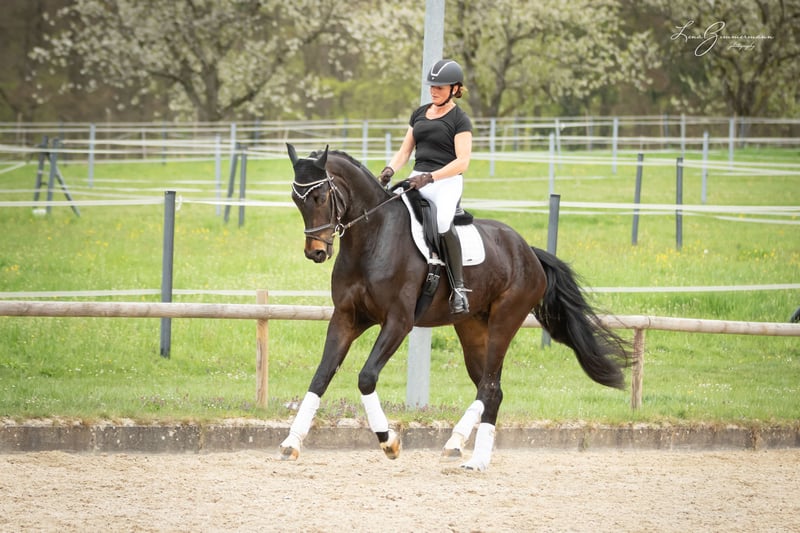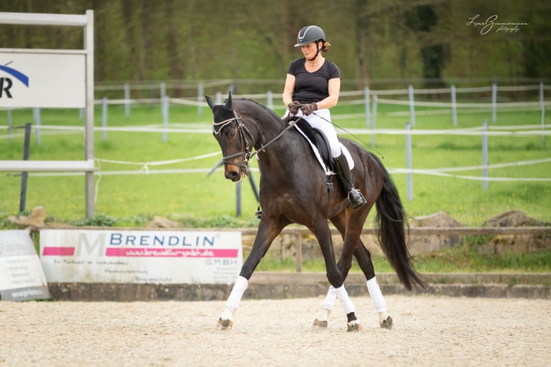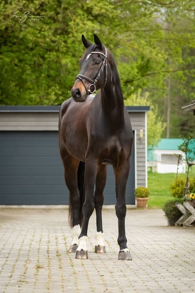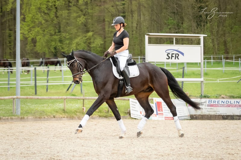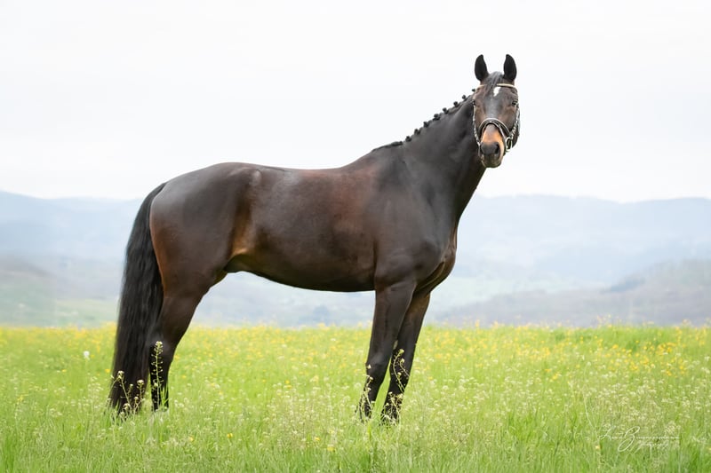 Beautiful tall dark brown gelding by For Romance out of a Riccione-Rubinstein mother. Born 2018 Height 1.79 m Completed L-level dressage Safe in cross-country, He also enjoys jumping and can be further developed.