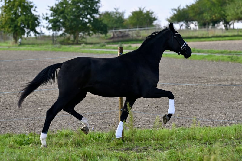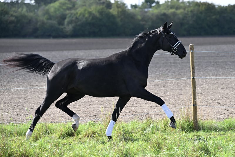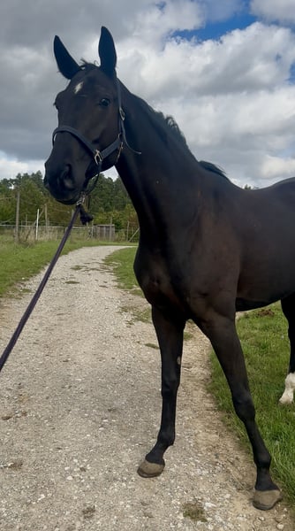 * V.: Despacito x Foundation - Sandro Hit, De Niro, Weltmeyer, Don Nobless, Dancier, Fiedertanz, ... * 2021 geboren * Stute * zur Zeit 1,70m Stockmaß * Herdenvertraglich * Verladefromm * Anreiten bisher völlig unproblematisch * Würzburg * Transport gegen Aufpreis möglich * Beritt möglich * Große AKU für ca. 800,- * im Auftrag Eine absolute Granate mit einer wunderbaren harmonischen Aufmachung in einem schönen Lackschwarz mit gleichmäßiger Zeichnung der Hinterbeine und einem absolutem traumhaften Gang. Die Stute kam komplett roh zu uns und hat eine schöne Entwicklung gezeigt. Im Umgang ist sie artig, aber kennt noch nicht viel. Das Anreiten von Sattel, Trense, Doppellonge über Hufe geben und das Drüberlehnen und erste Draufsitzen verlief absolut problemlos und angenehm. In der Halle hat sie noch ein bisschen Stress und löst das über das Vorwärts laufen an der Hand. Dies wird kontinuierlich besser. Es werden nur ordentliche Anfragen mit ernsthaftem Interesse beantwortet. Auf unverschämte Anfragen wird nicht eingegangen. Für das Probereiten nehmen wir 25,-, welches beim Kauf verrechnet wird. Anfänger nur mit Begleitung des erfahrenen Trainers. Preis steigt entsprechend der weiteren Ausbildung.